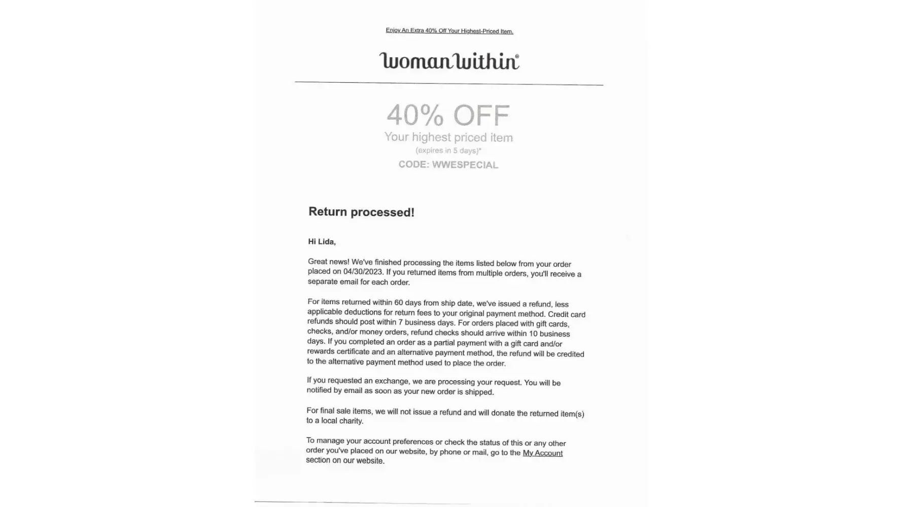 In addition to your site, I filed a complaint with the Better Business Bureau and received a call almost immediately from Woman Within advising me they were processing the rest of my refund and I should have it in 7 business days. If that does not happen, I may follow up with you again. Thank you. Reva Laituri