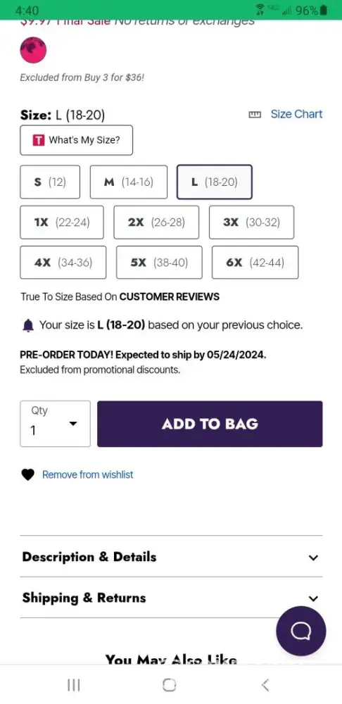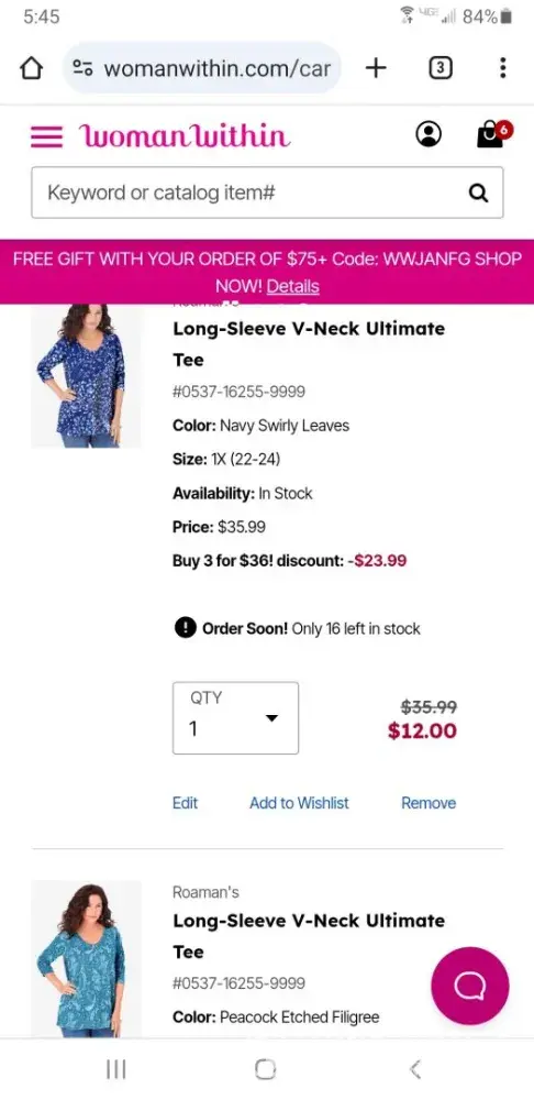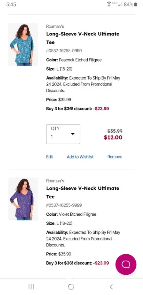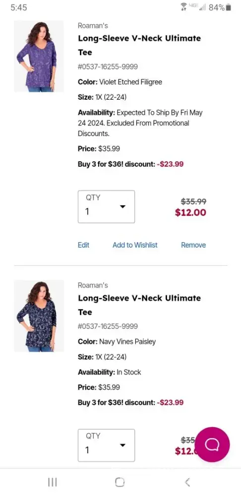 Roman's portion of Woman Within Clothing currently has advertised a 3 for $36.00 on printed long sleeve tops with a regular price of $35.00 each. I put 6 in my cart for the 3 for $36.00 sale for Jan 2024. I bought 6 tops total for this promotion. Out of the 6, 4 of those tops shows they are Pre Ordered status (not back ordered) and would be shipped by May 24, 2024 and are excluded from promotions.. but the price shows my discounted savings and new price in bright red print in my cart. It continues to show these discounts in bright red in my checkout portion, clearing my payment portion of the order. Because of previous questionable orders I called Roman's, talked to several people, was told that "Pre - Order today" really means "back ordered" and because the item states "excluded from promotions" EVEN THOUGH the discounts on all 6 items clearly carried into payment portion of ordering.. I would be charged full price for that top in May when it shipped out.. meaning that regardless of what I paid for my card would be charged a completely different amount, more than my order. This is deceptive business at its finest! This discount was a $23.00 savings on a $35.00 top on sale for $12.00 if I ordered 3. The majority of their 3 for $36.00 promotion items stated "Pre Order Today" status, making this promotion deceptive and worthless.