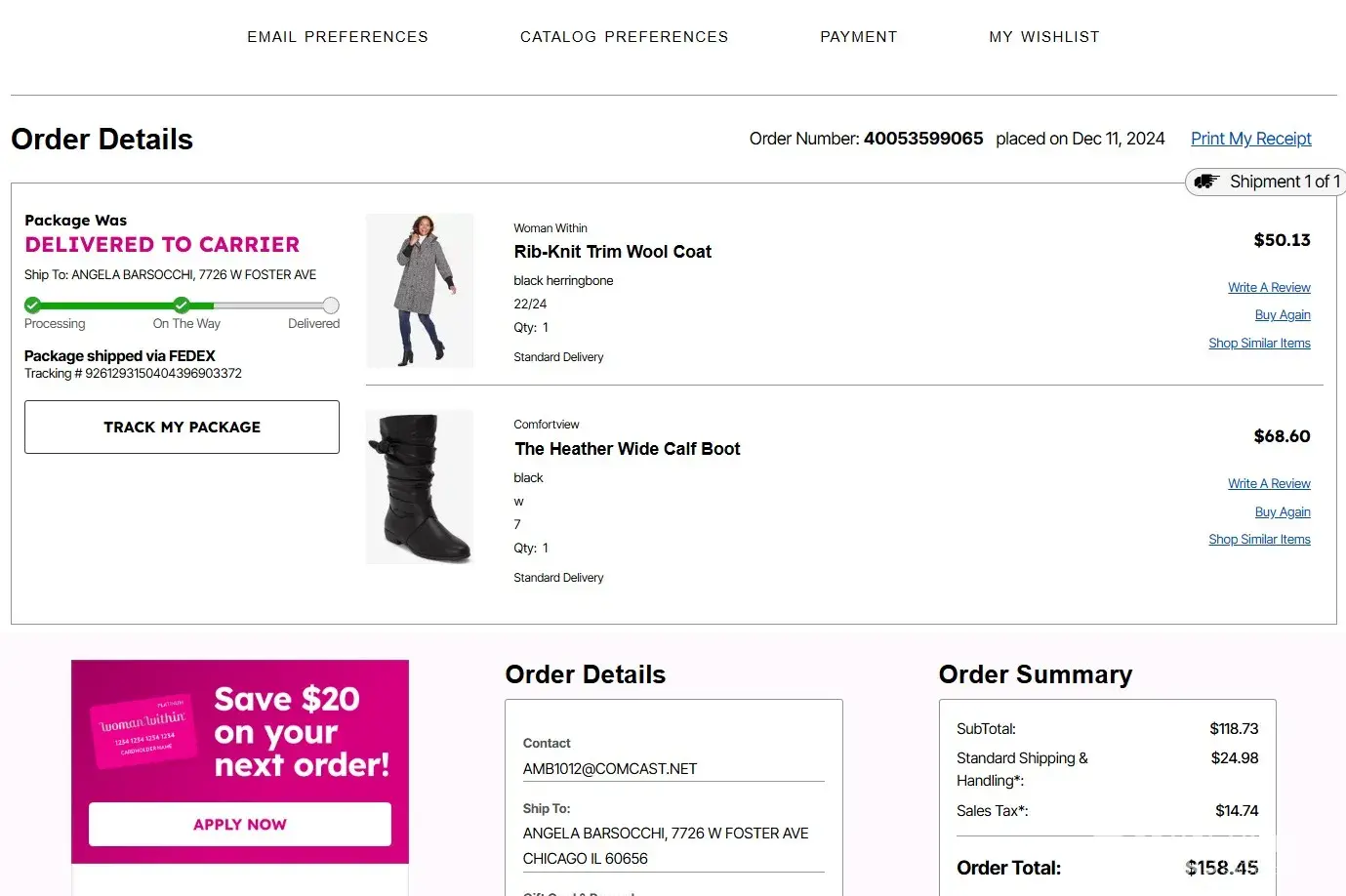 I purchased over $170 of clothing and the package was shipped on 11/14/23 through FedX. Women within debited my account the same day. I was given several delivery dates as each date arrived and the package had not been delivered. In tracking the shipping history of my package I found it has travelled through the same 3 locations two times each and has been stuck in the last location since 11/28/23. Today, 12/2/23 is my most recent delivery date.