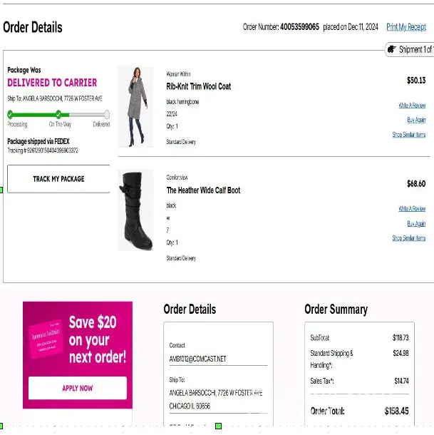 Ordered items August 3, 2023. Today is August 24. No package to date. Tried to check order status online. Only thing it showed was "processed". Called "customer service" (which is located in India). Used automated function to check order status. Said order was shipped August 4. So, I called customer service line again. Put on hold to wait for representative. After about 5 minutes, call was cut off. Called again. Finally "George" answered the call. I explained that I have never received my package that was supposedly shipped 20 days ago. He put me on hold, came back said was shipped Aug. 4. I told him I had just told him that. He put me on hold again. Came back said was shipped via FedEx. I explained again that I have never received the items. He said the package was left outside the "glass" of my residence. I live in an apartment building. Advised never received. After awhile he finally said he would report it as a "lost item" and that I would need to fill out and sign an affidavit form that he would request. Said it would take 7-10 business days for me to receive. Then the company would investigate! IF they receive the item back, then a credit could be issued! In the meantime I have been charged for the items...the same day I ordered. And the shipping charge was around $18 and I will be charged interest each month as well! This is the worst customer DISSERVICE I have ever received. I have had issues with the company before but this went way beyond any of the other times. Unfortunately, when you're a plus size woman with limited financial resources, we have to put up with a lot of poor service. I am elderly, in poor health, and on Social Security. Companies just don't seem to care about consumers anymore... unless you're rich.