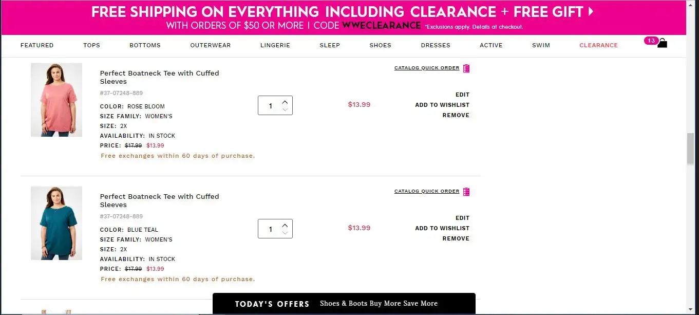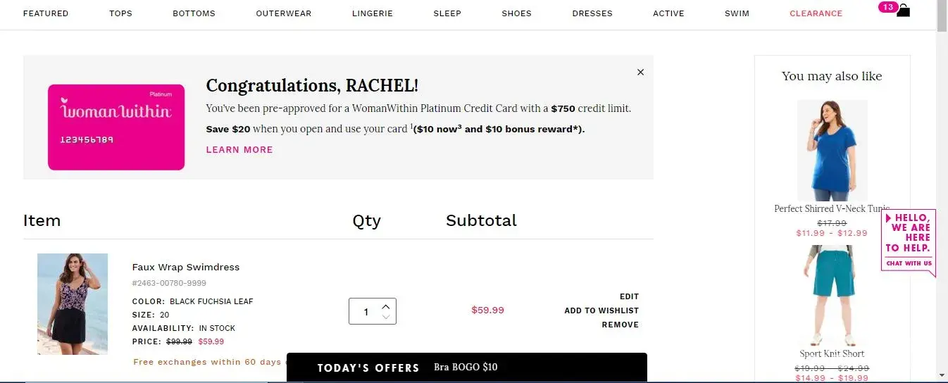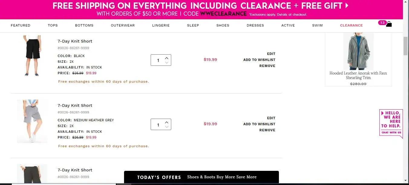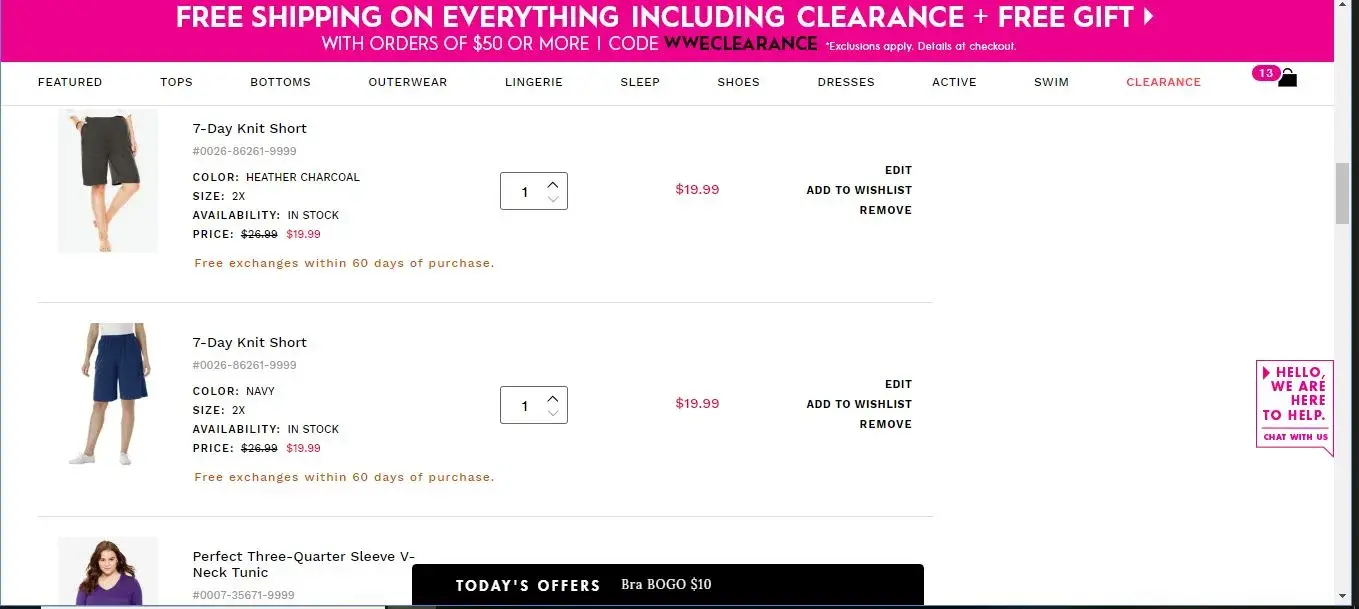 Now I just went back into my cart to take another screen print of what I had in there and the WW c/s rep added a pair of shorts. I know that I did not add them because I would NEVER wear something so short! I am livid. (It would be the Taslon swim shorts)