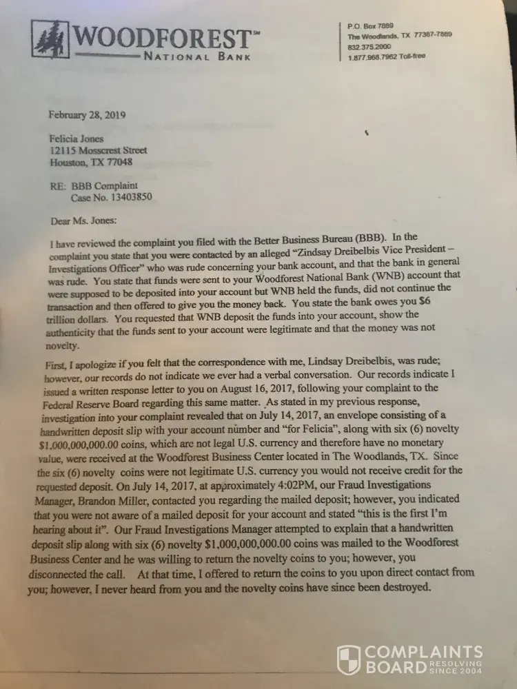 I am waiting for response and received one yesterday b/c of the complaint I submitted. I am waiting to have ALL of my NSF reimbursed because of lack of follow up by the local branch and no responses to my messages. It takes one -two week for Woodforest to respond to messages. I appreciate the contact person calling me yesterday and will wait to see if it is resolved and NSF reimbursed which would also mean that my check for 81 that was rejected twice and others would have been sufficient and funds to covered had they listened and followed my request at the local branch as well as in my messages. Thank you.