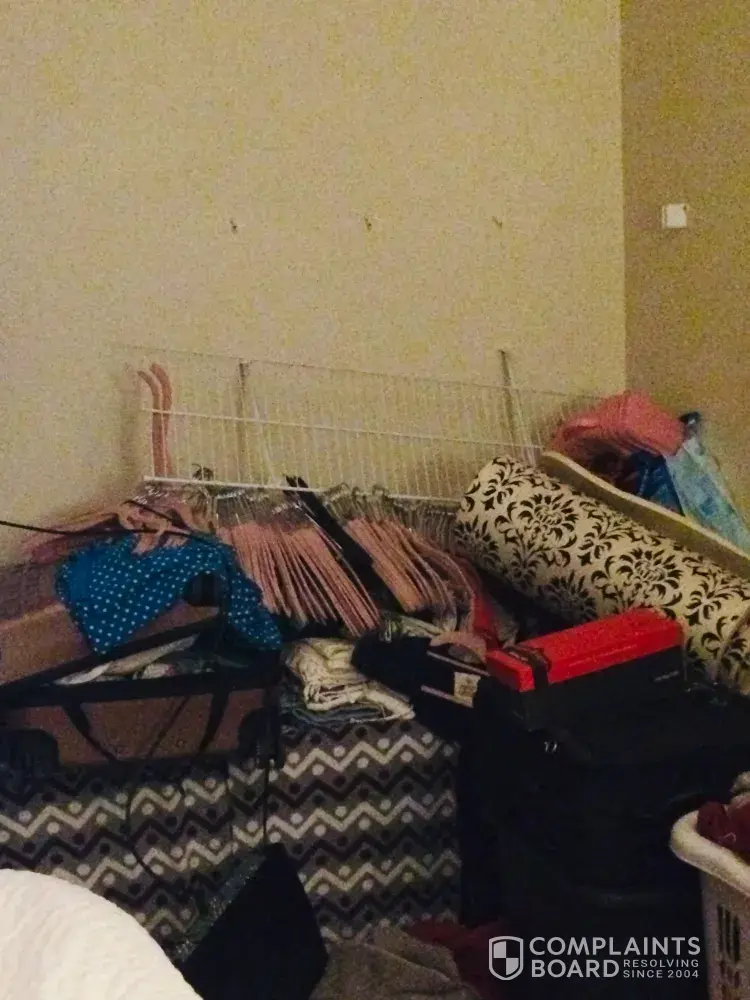 To add to my frustration, the upstairs guests from me started stomping and banging furniture around at 10 last night. A few min after 10, my entire clothing rack came crashing down. The manager rudely tells me that it is about weight not the rumbling coming from upstairs. I then inform him of my cleaning and roach spraying fiasco over the weekend where I took things down and removed even more weight from the rack, thus could not be due to too much weight, but he wanted to place the blame on me. Meanwhile he is not listening to the fact that I had to get back out of bed a little after 10 last night, move and untangle all my clothes from the floor formerly crawling with roaches, and they are now piled on top of a suitcase on my bed making it difficult to get to the clothes I do need. I have rather expensive, felt-covered hangers, several of which are now broken in this event.