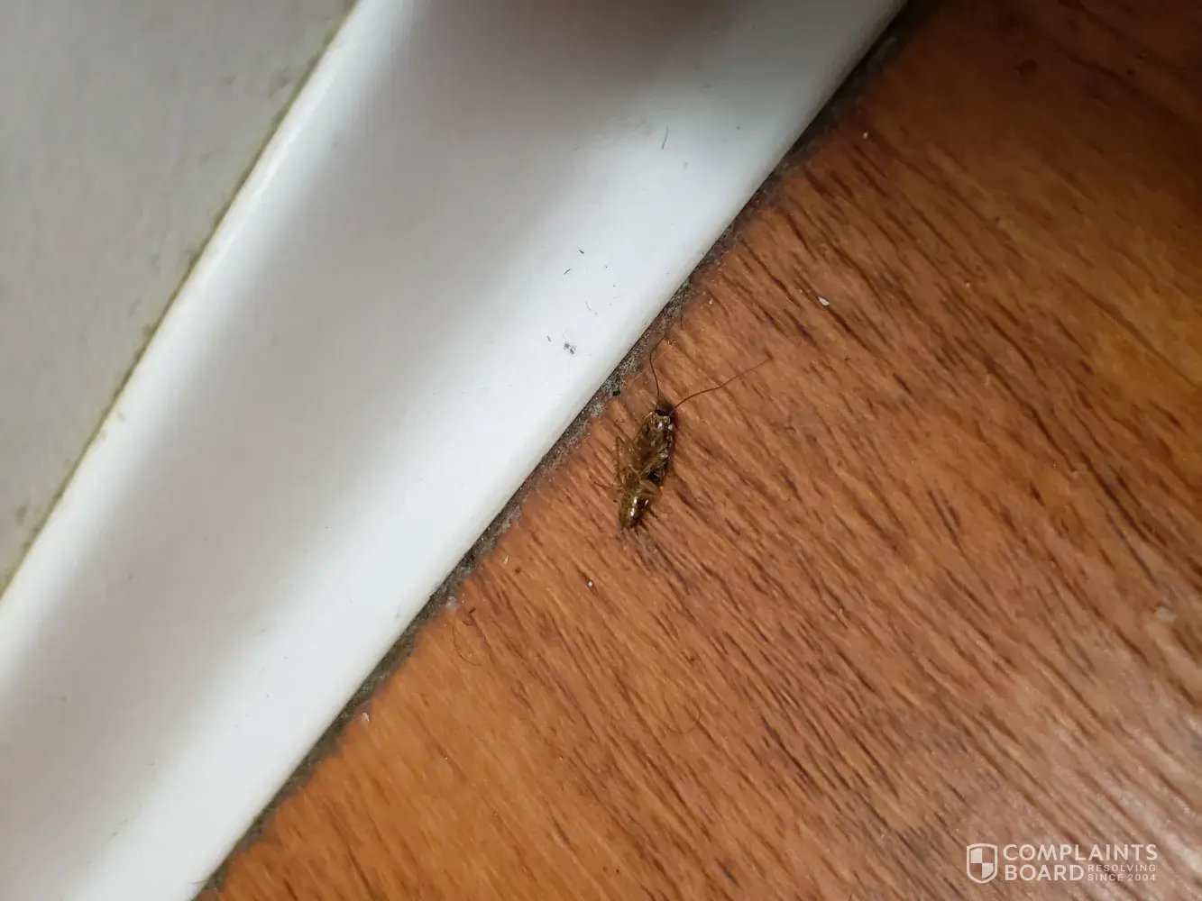 The below pictures are of the fallen rack with all my clothes down and just one of dozens of roaches I have had to contend with for the past month. I would have more pictures, but I have a life and don't feel that photographing roaches to show people how nasty this place is should have to occur, but maybe I should start.