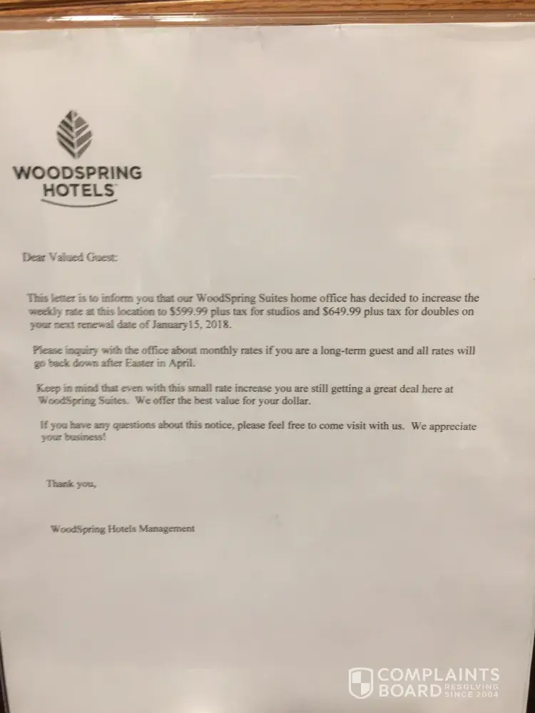 On January 15 the WoodSpring Suites in Davie, Florida increased the rates. The establishment put up notices prior to the 15th to let all the guest know. Three days later they increased the rates again another $300. This time they didn't give any notice to any of the guest. They just posted it on the billboard outside what the weekly rate was now. How can any of the guest prepare themselves for something like this. They have made the guest feel like what was once affordable is now astronomical. They are saying it is corporate that's making the rates go up. Well thank you corporate for making me and my family now homeless. I now have to find a new home for my dog. They told the guest if you can't pay you can't stay. Thank you again corporate for making me and my family homeless.
