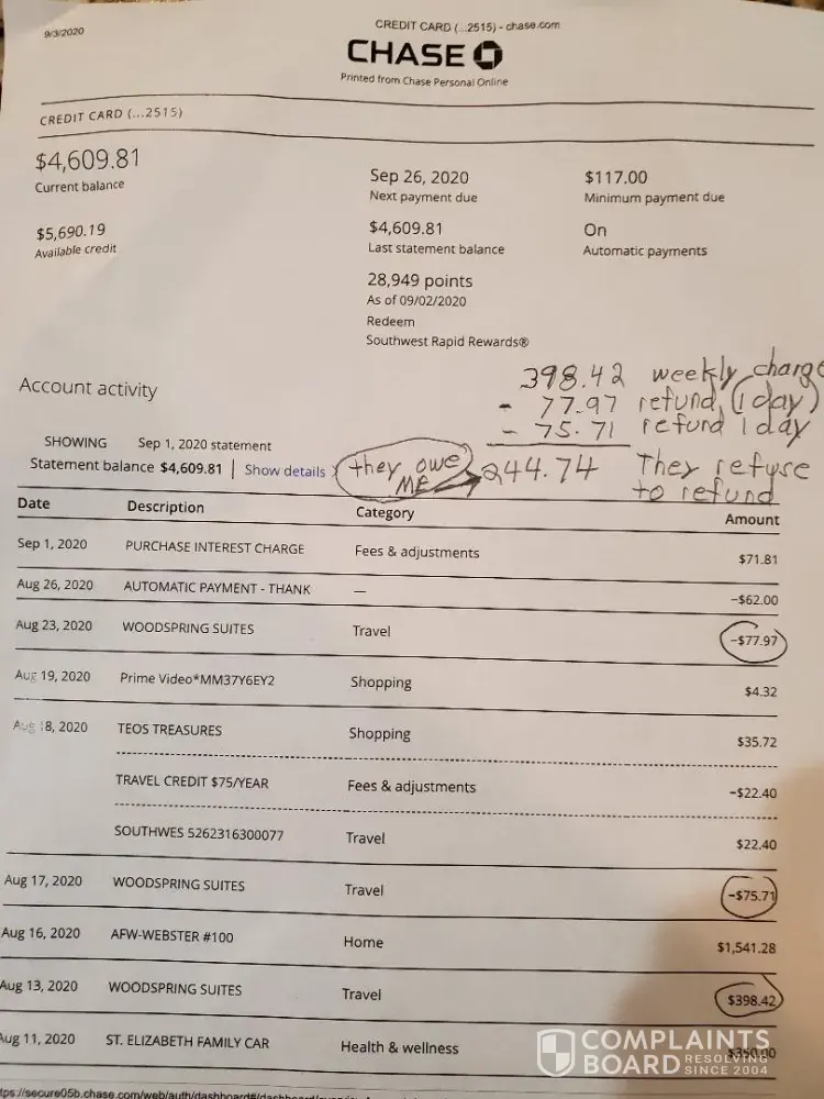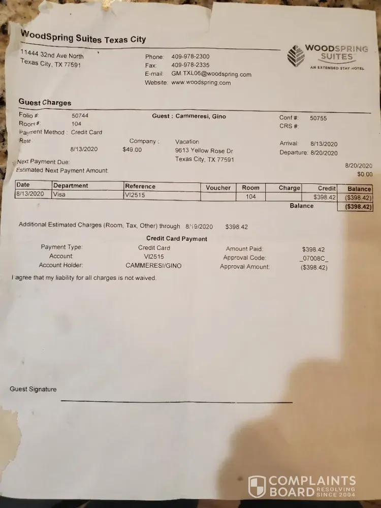 On thursday 8/13/2020 I checked into the woodspring suites in texas city tx for a 1 week stay. They billed my credit card $398.42 for the week. Due to a family emergency I check out friday 8/14/2020 or the very next day. They charge me $153.68 for a 2 day stay and $398.42 for a week and I was informed by the front desk and manager that the $398.42 that they...