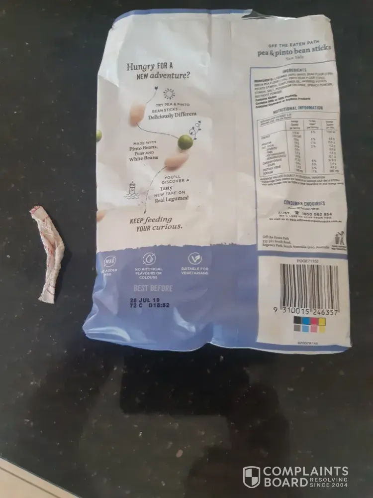 I am writing a second complaint form online as I have not heard back from Woolworths. The first was submitted last week on their online form. I will be writing to the CEO of Woolworths if I do not get an answer/acknowledgement from them. I purchased the above pack a week or so ago from Woolworths Oxenford, Queensland and found what looks like a used first aid dressing inside. My husband and I consumed most of the pack before discovering it. We have been loyal Woolworth customers for years and are disappointed with this. Please confirm this is received as Woolworths have not bothered to reply. I would like compensation as I feel sick not knowing what we have consumed. Thanks in advance.