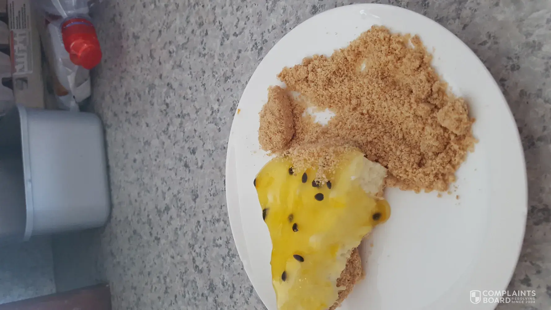 I am complaining because the crumb at the bottom of the cheesecake is very crumbly like sand. There is nothing binding it together.
