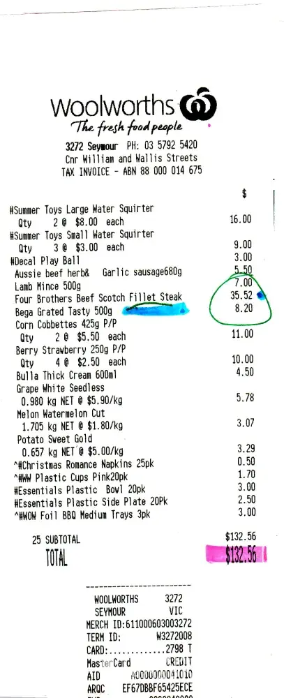 On Thursday the 27th of December I purchased a kri vac pack of 6 scotch fillet steaks at a cost of $35.52 from the Woolworths store in Seymour, I don't know what or where this meat came from but it was so tough that it was inedible, and I don't just mean tough, it didn't matter how much you chewed it, it just didn't break down at all to be able to swallow it, probably that glued together crap, not sure but very expensive dog food which is what it became. Thankfully it was for a barbecue and I had plenty of other meat to feed my 22 guests or we would of all gone hungry.