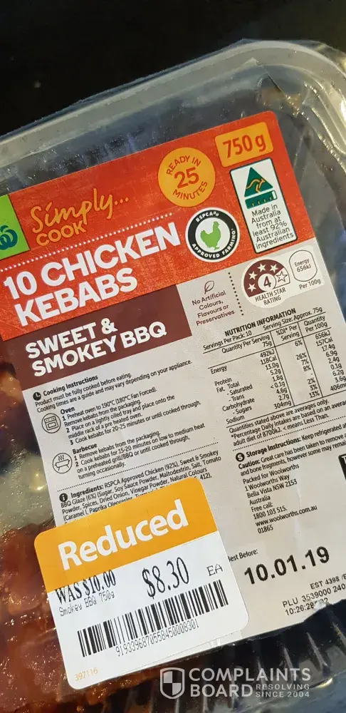 I bought these kitchen kebabs, brought them home and cooked them, inside, on a grill. Once I served them my son found a fly covered in bbq sauce, cooked into the chicken. The whole family was disgusted as you can imagine and we had to send out for pizza. Very disappointing and left us concerned about the cleanliness of the prep area in our local Woolworths.
