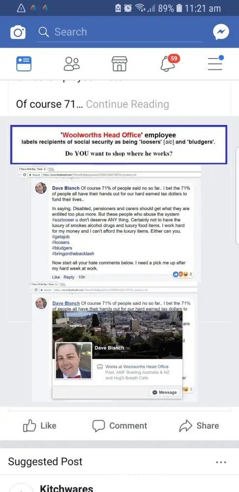 A posting on Facebook by an Australian "head office" employee has vilified, abused, and denigrated people receiving Social Security entitlements ("welfare benefits). The post has caused me to feel dirtied and stigmatized and as if Woolworths might also hold such views. I will be unable to continue shopping with Woolworths until an official and public response is made.
