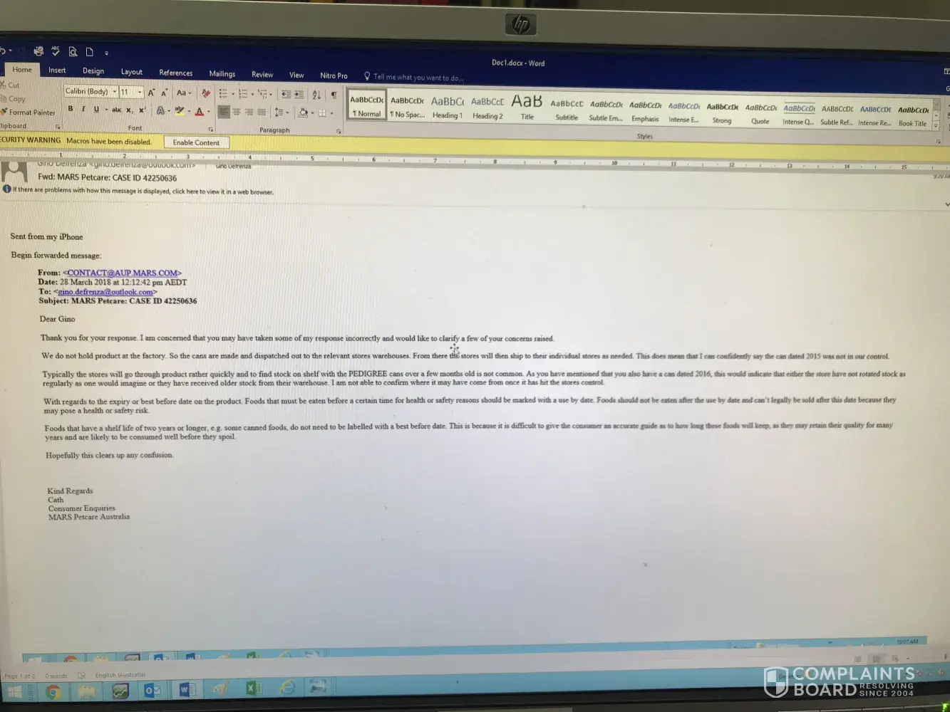 I wish to bring this to your attention as the issue involves extremely poor quality control and a significant safety risk on grounds on potential injury to humans and a risk of food poisoning if eaten by the dog. I will attached corresponding emails between me and customer service of Pedigree for your reference. It appears that Pedigree hold no claim of responsibility for this event or potential future events.