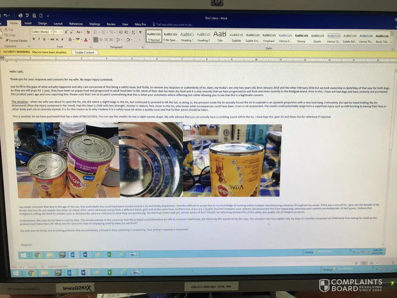 I hope that Woolworths takes this complaint seriously enough to review their systems and investigate further if there are other products on their shelves with these extreme packaging dates. Pedigree seems to have washed their hands of it and are not considering the safety aspect of this. As parents, how common is it for an adult to ask their child to feed their pet. I wouldn't like to think my child was scared for life if a tin cut their face open. I hope that you agree.