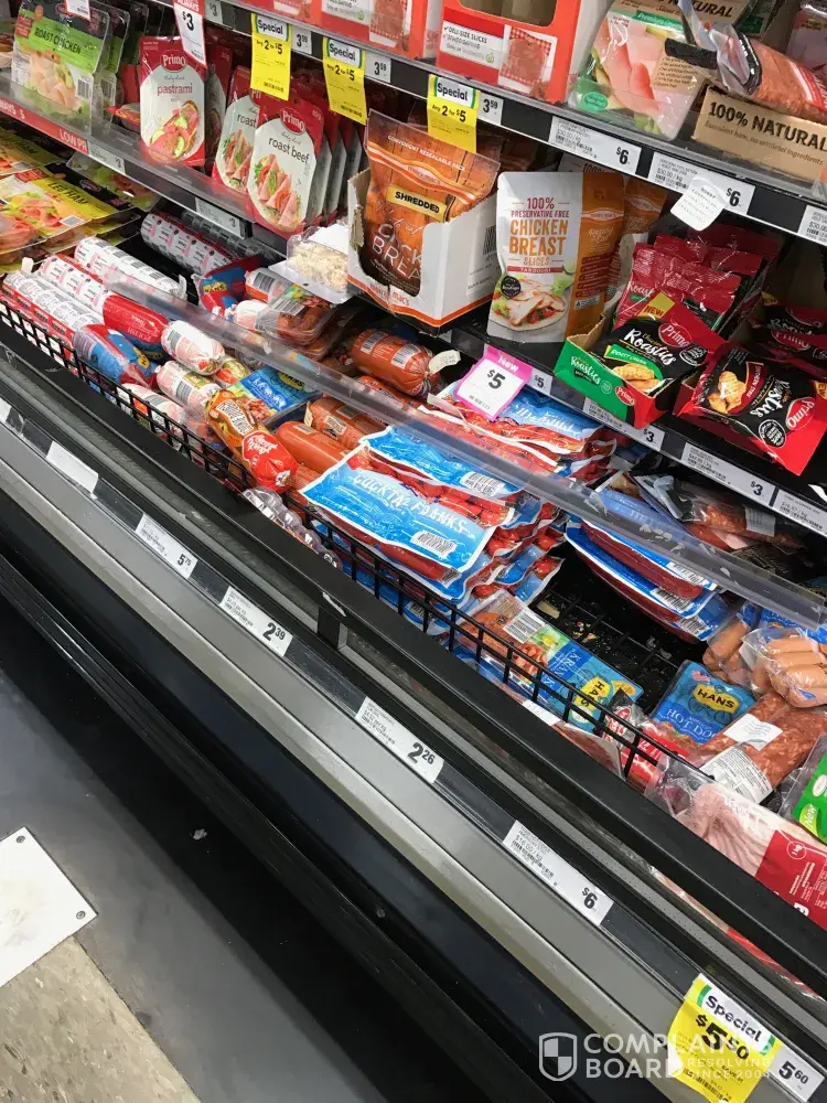 Purchased 4 no. Prawns $8.99 reduced to $4.50 and 1 no. Salmon $12.00 reduced to $6.00 today. Original bar code was covered and we finished up paying full price for all products.