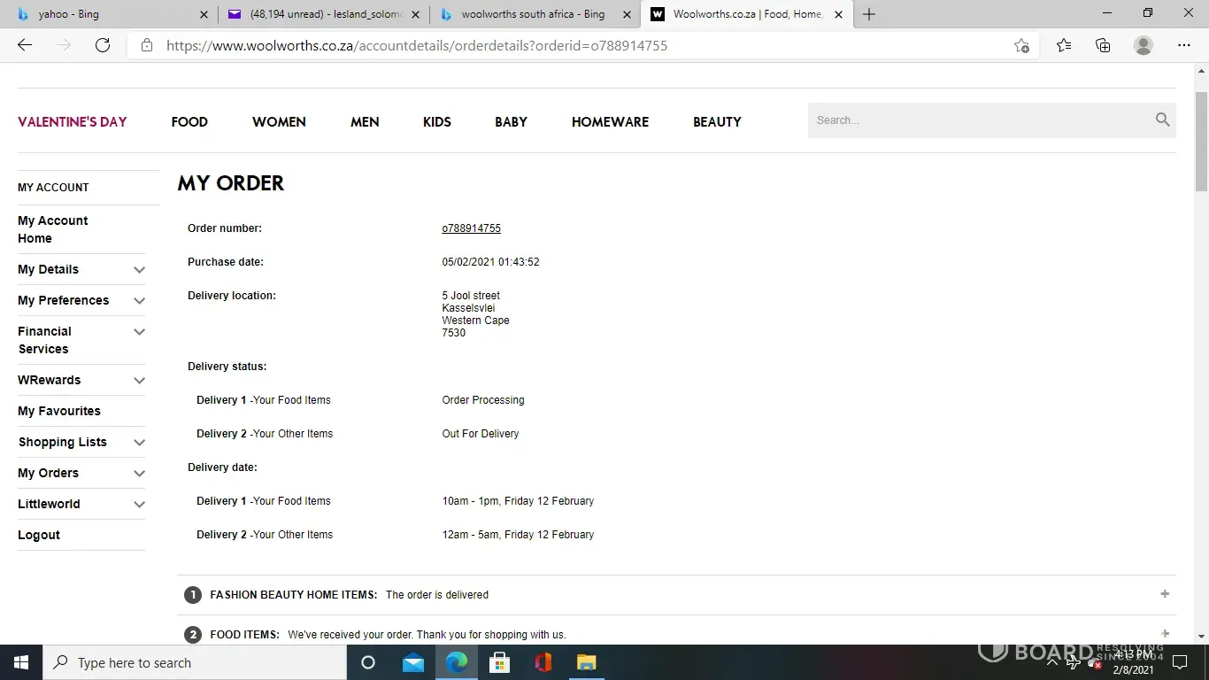I placed an order 29 December 2020 Delivery dat 2 January between 10-1pm. I waited after 1pm, nothing. I called the online contact centre, they told me by the latest 2:30. Well still nothing. I couldn't leave the house because i was waiting.. Then i called again and apparently they couldn't get hold of anyone at the courier services. The lady would contact me as soon as she got hold of someone. Nothing.. The driver rocked up at 5pm, with no excuse. My issue is why give a time line if you cannot fullfill the client's needs. Why not contact the client and ask if you can deliver the next day. Why did i have to call and receive false information and then none. Its like nobody cared. I logged a complaint to the online department with the order number which everytime i called with that number they picked up my details. Now when i logged the complaint they came back saying that they cannot pick up my account details and that they need other details of mine. This was 2 weeks after. Then they came back saying they have sent an email to the courier company to ask for an explanation. Last week i got an email after i asked what happened to my complaint, they told me that they haven't received any feedback yet. I think this is adding insult to injury. After waiting forever for your delivery and then receiving no joy with your complaint. This is my first time complaing. I am highly frustrated and disappointed in the horrible service i received from Woolworths Online. The fact that there was no contact made from your side Woolworths when the delivery was overdue as well as when i requested an answer as to what went wrong. No one cared to pick up the phone when i logged the complaint and salvage the client relationship. I'm sure i wont get any feedback here either. This is what i am now accustomed to from you Woolworths. I still didnt receive any explanation to date. A month later. You do not care about your clients!