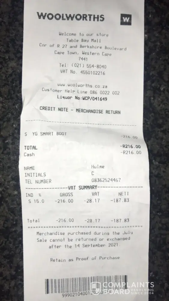 We live in Durbanville and Woolworths Tyger Valley never had the below boots in a size 11 in stock, of which I needed two pairs of the same size 11 for my twin daughters. We were informed that there were two pairs of size 11 at Table Bay Mall, but that no IBT could be done, as the boots were on sale. So my 70 year old father drove to Woolworths Table Bay Mall on my behalf, as I work during the day. On arrival the exact two pairs of size 11 boots were found and both were in sealed bags with an 11 size sticker on them (see below image). When my father returned back to Durbanville, we discovered that we had three size 11's and one size 12, which is bizarre as well as totally unacceptable as it is the responsibility of the cashier to CHECK the shoe size and not that of the customer. So off my father went back to Woolworths Table Bay Mall Customer Services to address the odd size 12 boot that would be of no use to us at all, as we need two size 11's. Customer service Woolworths Table Bay Mall checked if another store stocked the shoe and size, but no luck was received. Assuming there must be another odd pair of a size 11 and size 12 boot in the store, but no one bothered to cross check the store rooms or provide any further assistance in sourcing the correct boot to me. The one pair was refunded at the sale amount and my father made his way back to Durbanville with no luck. I'm left with twin girls with one set of 11 size boot and that's where the matter ends and Woolworths is quite happy with themselves at that. I will not accept that Woolworths made this disappointing mess and I require two size 11 boots.