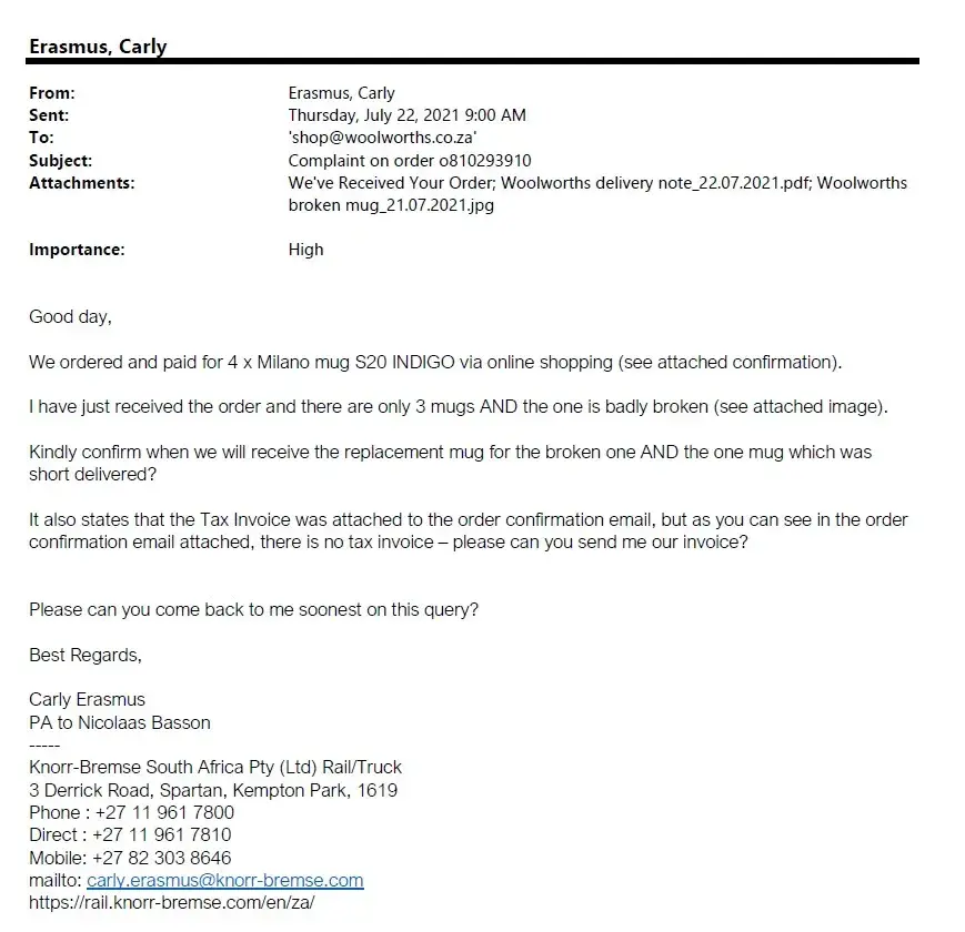 I sent the below complaint to Woolworths on Thursday, 22 July 2021 and still have not received any correspondence other than an email acknowledging receipt of our email.
