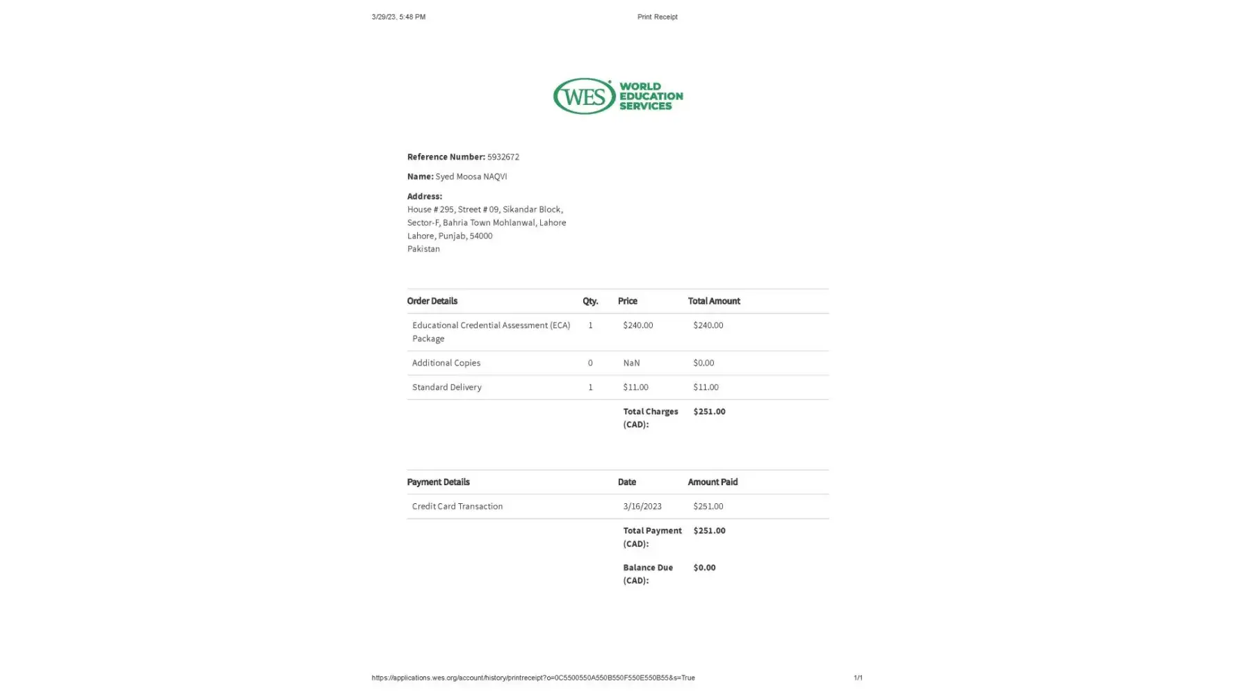 Amount Paid: CAD 251.00
