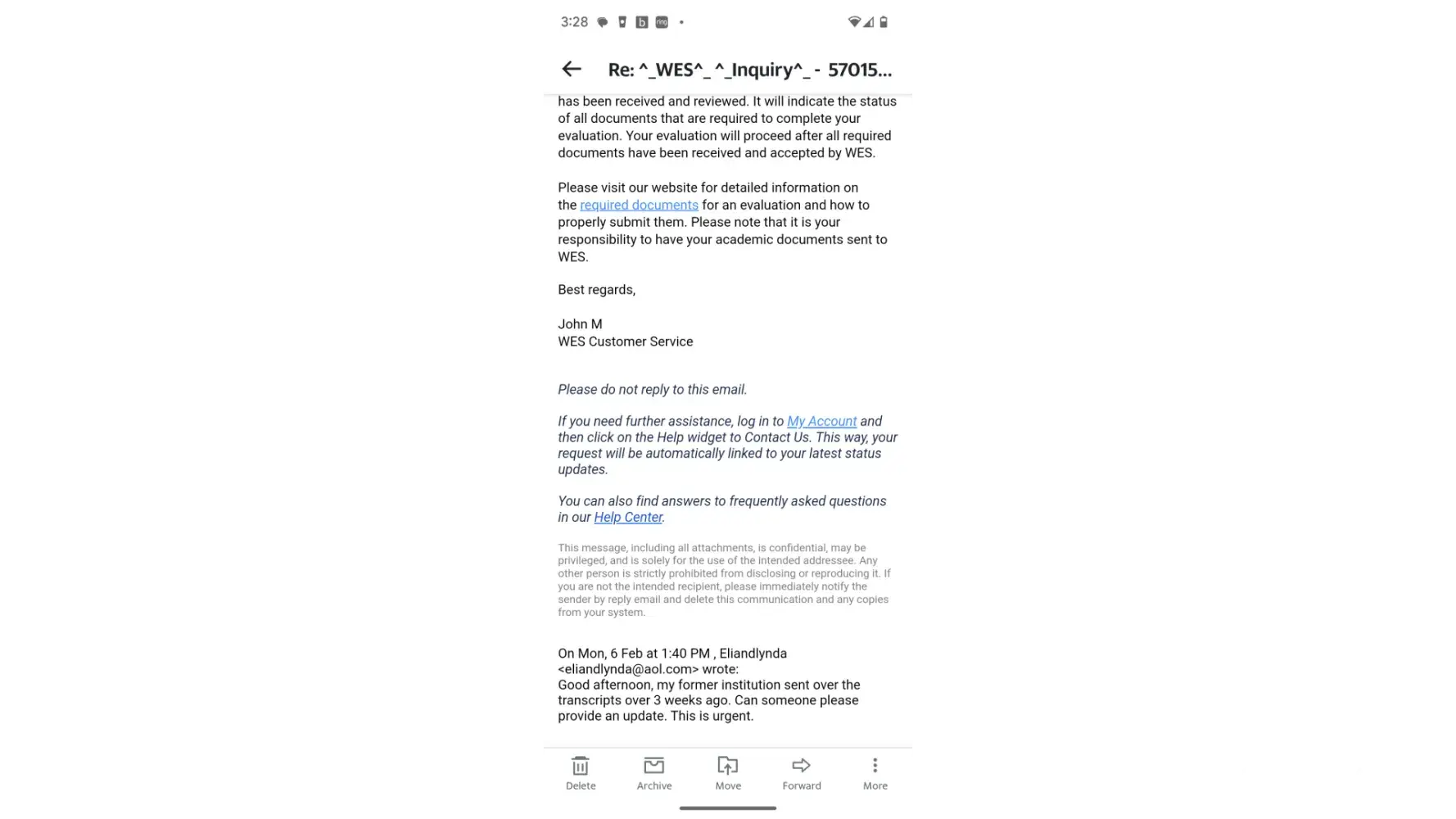 WES is severely not responsive to concerns from their customer. It has been 2 months since they have received my documents for evaluation and to this day, the documents are still on their way to my institution for verification with no word on who or how they sent the documents to. What if the documents didn’t arrive or be received by my institution? The least they can do is inform their customers to whom or how were the documents sent so their customers can follow up on the respective person.