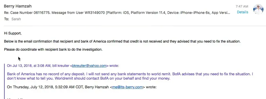 I am really disappointed. This is really expensive lesson and cost me $1400 . i hope this also can be a lesson for all of the reader to not use worldremit service to send money . and if worldremit read this, i hope he understand better his customer and can further investigate the issue.