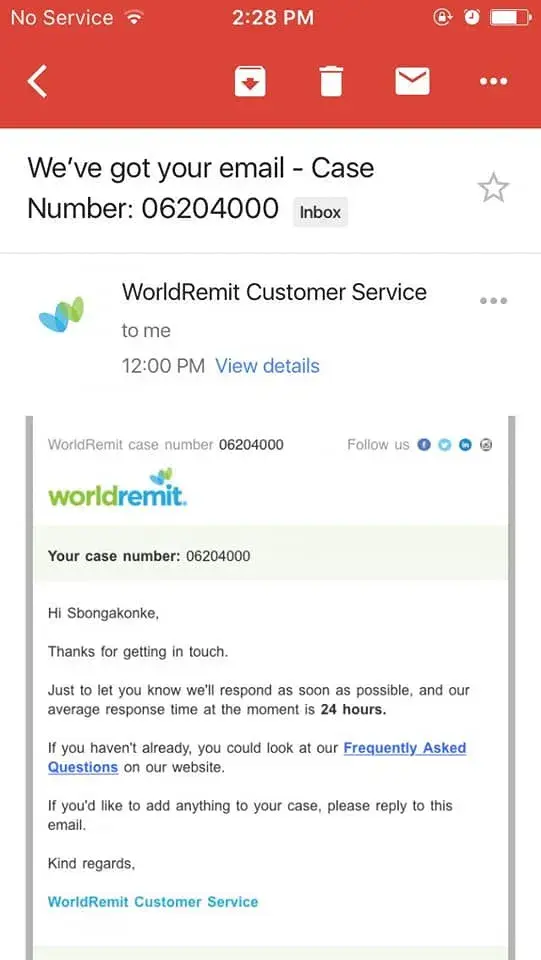 Another two days passed (june 8th), and still there had been no reply to my first enquiry, nor was there any change to the status of my transaction. Nor had I received any indication that world remit had received my money. I sent another online enquiry, asking that if world remit was unable to transfer my money, that they cancel the transaction and refund my money (case no. [protected]). The automated reply I received stated that the average reply time was 48 hours on average.