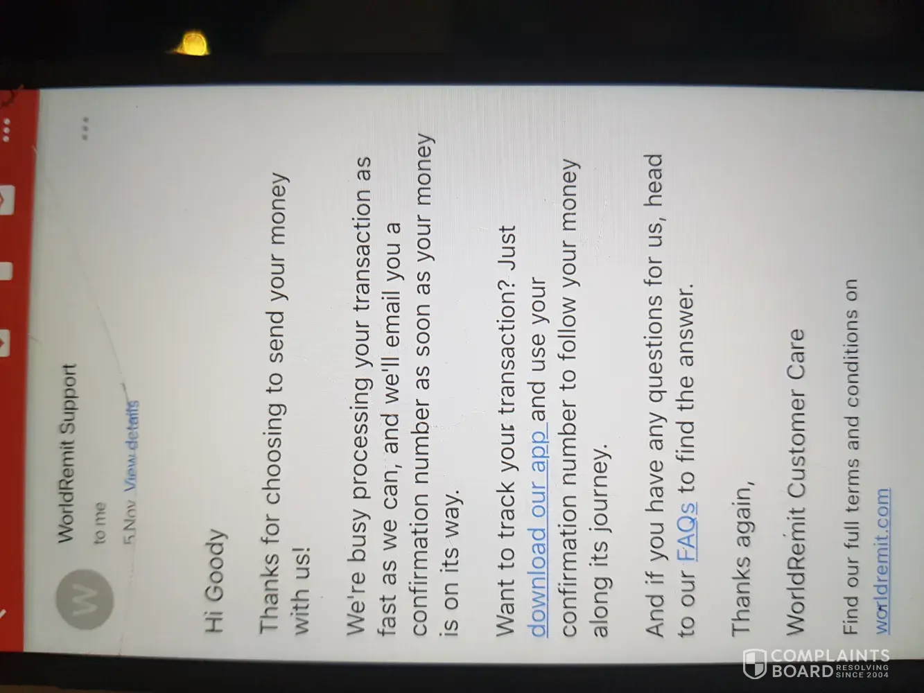 I am residing in Australia. I transferred $48600 through world remit to be receivied in India by my father. I did this transaction on the 28th of August. The compliance team picked this transaction up and asked me to send my most recent payslips which I did and then my bank statements again I complied. Then they asked me where I got the money from which was borrowed from my friend which clearly is stated on my bank statements. After that I haven't heard from the compliance team. I have emailed them the same again and again but no response. Hence I tried cancelling the transaction from the last three days from 10th September. The consultant over phone told me they are waiting on the compliance team to respond. I said I would like to talk to compliance as they are not responding to my emails. Was informed that compliance don't take calls only communicate through emails. I am stuck and my money is with world remit from two weeks now. Please help me here on what forum to escalate this to as world remit does not seem to be hearing me.