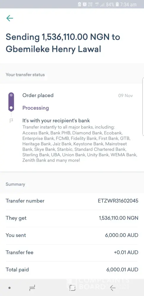 The transfer was initiated on 27th July 2018 for $1400 USD, but until i write this complain (2 weeks after), the recipient still not received the money. All the details provided are correct in the transfer.