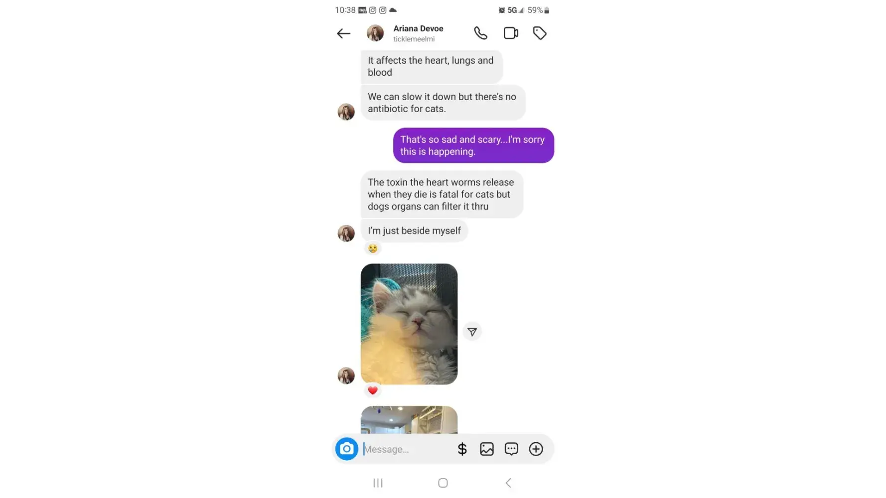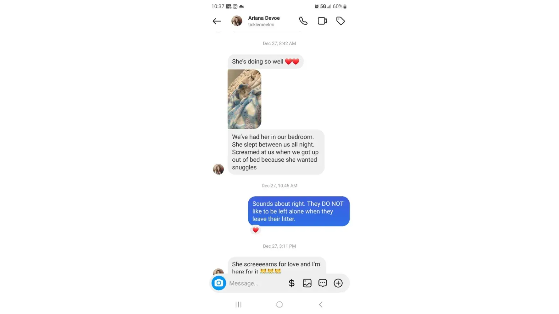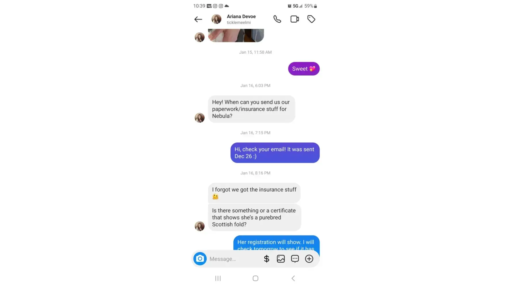 You are actually insane. If you had an issue, you'd come to me. Funny you have time to send a multitude of pics and texts about how great the kitten is, but now say you had no time to say she was sick. Right 🤣 I have not seen any type of documents other than you saying kitten had no issues for WEEKS after leaving. Funny if she was sick at arrival how you'd introduce her immediately to your own cats. That doesn't add up. I'm done replying to an insane person, and FYI, nothing posted on this [censored] board, that does nothing to verify the claims are actually true, can be redacted. If you post my personal info, its called doxing, and that you can actually be a criminal complaint. A user name is not personal information.