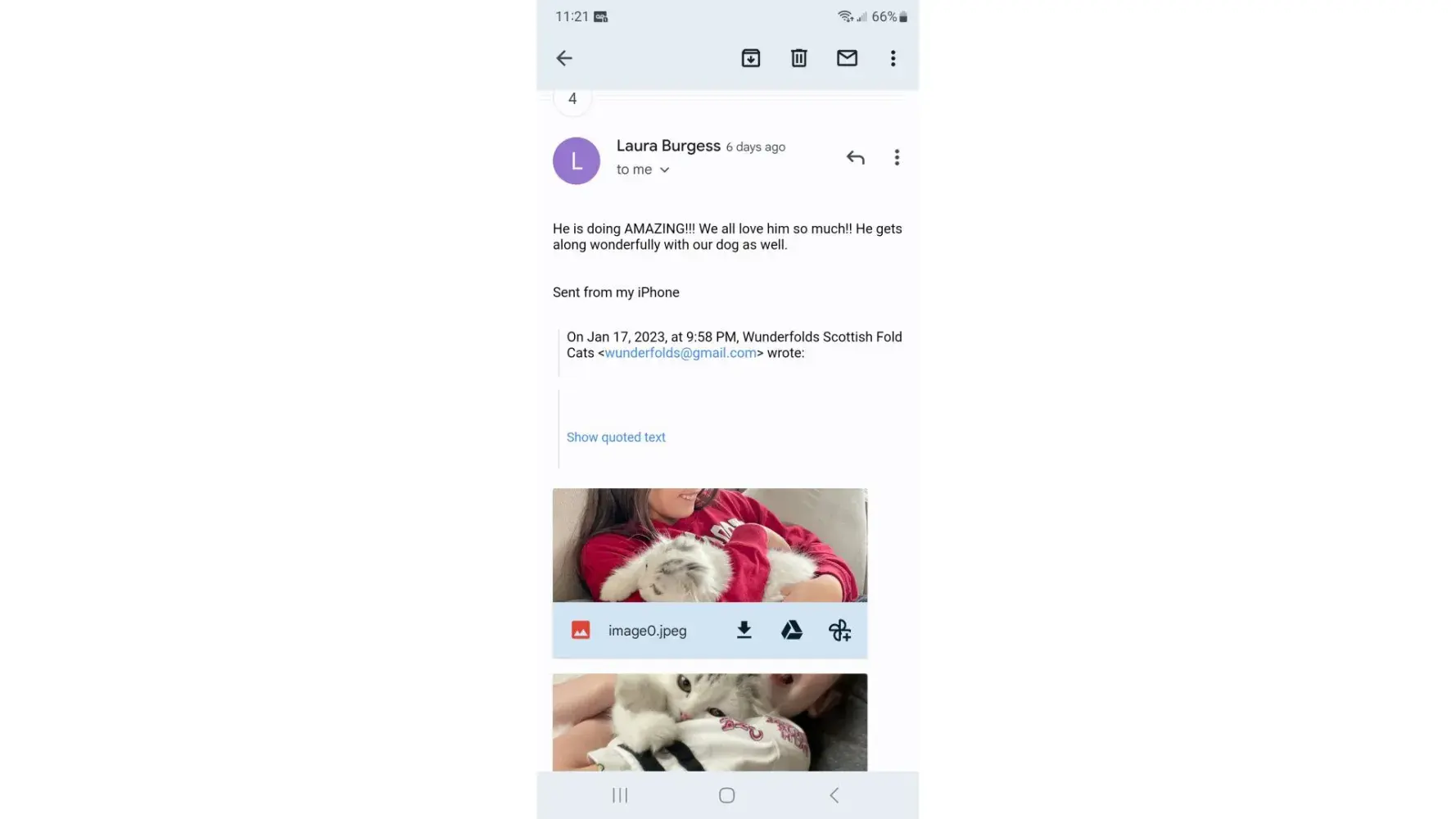 Also, we had a total of only 6 cats in our office space, one mom and the five kittens. This was the only kittens in our entire cattery at the time. I'll attach SS of the other buyers I've been in contact with, one who also took the mom, stating no issues with their kittens or other cats that live in their homes.