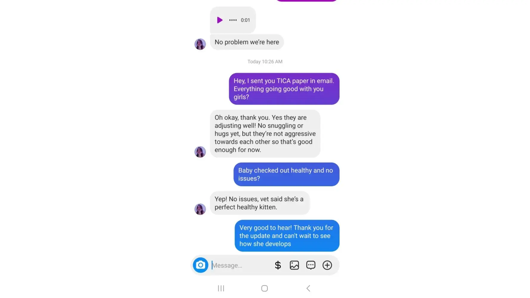 I have evidence that this buyer has falsified everything, and will post as such. Her kitten was healthy when leaving us, had a healthy well check with proof provided by the buyer. Multiple message and photos sent to me stating how awesome her kitty is with zero complaints. 2 weeks later, her cats came down with something, and she asked me if my kitten could have had a virus because her cats are sick. Mind you, she said my cat has no symptoms. A week later, more pics and my kitty still no issues and says her cats are also fine. This week, I had a visit from animal control, stating kitten was sick at arrival, covered in poop, and my home is filthy. I let them in right away, because people that buy from me know my home is extremely clean, kittens bathed prior to leaving and no cats sick here. Animal control even complimented how clean and well taken care of, and also said kittens can come down with things as they are exposed to new bacteria. I will attach the report from AC when it is sent to me, but I have a book full of screenshots of all conversation with the buyer, and never ONCE did she state her kitty from me is sick. What is likely, is her vet is a breeder hater, took advantage of this buyer with ridiculous charges for simple virus her cats had, and threw blame at me, because a healthy kitten would not be shedding a virus to get her cats sick. Stressors such as a new pet can make resident ones she'd viruses they harbor, and being that my kitten was never sick per her messages, if my kitten now has a URI 4 WEEKS LATER, it's likely her cats that infected mine. Even so, kittens get URIs as they are exposed to new bacteria and develop their immunity. Please see attached screenshots to see how much this buyer is lying.