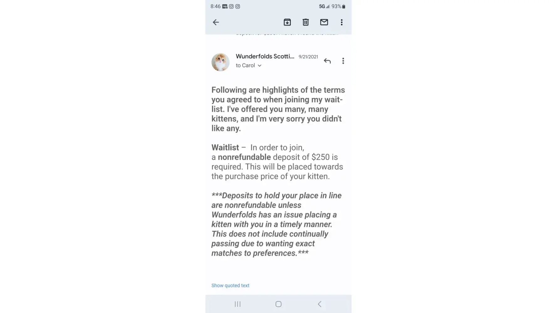 There are no guaranteed refunds. Waitlist is made clear it's non-refundable, and Carol was in line for over a year, offered many, many kittens, and then let me know she didn't want to be on the list a year and 3 months after being added. She was sent a response, so saying no reply was made to her is a lie, and I'll attach what was sent via email to her.