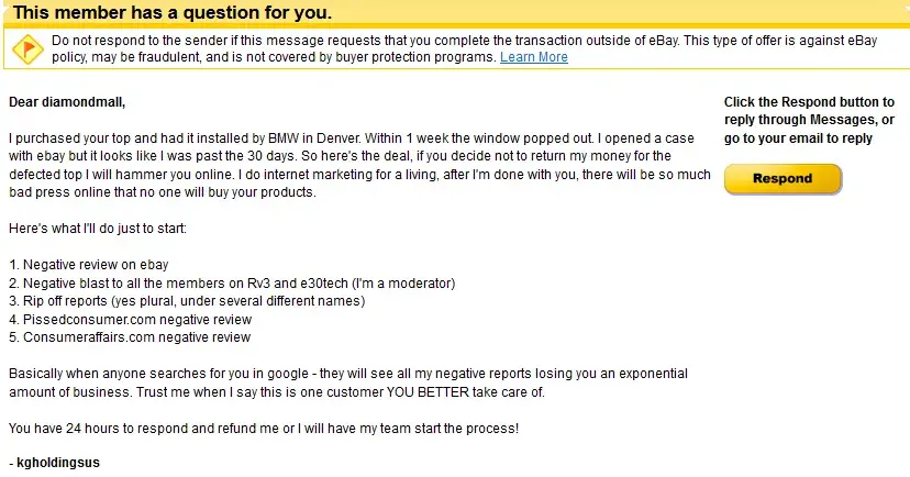 I opened a case with ebay but it looks like I was past the 30 days. So here's the deal, if you decide not to return my money for the top I will hammer you online. I do internet marketing for a living, after I'm done with you, there will be so much bad press online that no one will buy your products. Here's what I'll do just to start: 1. Negative review on ebay 2. Negative blast to all the members on Rv3 and e30tech (I'm a moderator) 3. scam reports (yes plural, under several different names) 4. Pissedconsumer.com negative review 5. Consumeraffairs.com negative review Basically when anyone searches for you in google - they will see all my negative reports losing you an exponential amount of business. Trust me when I say this is one customer YOU BETTER take care of. You have 24 hours to respond and refund me or I will have my team start the process! - kgholdingsus