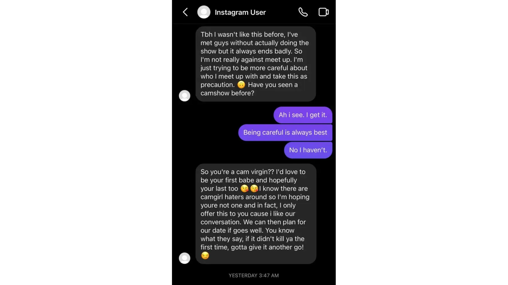 I recently had a conversation with someone on this site, and she offered me a cam show. She is attractive, and I found it hard to decline her offer because she was nice and open about her profession. However, she made it clear that she wasn't interested in meeting up, which I respected. Ultimately, I'm just looking for someone to chat with online.