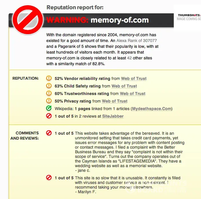 There are many warnings regarding Memory-of.com and the website could also be related to the following sites, and a few others.