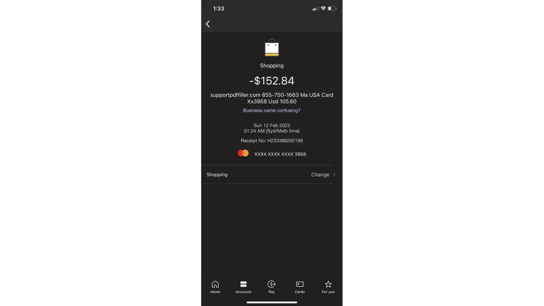 An unauthorized charge of AU$159.23 on my bank account on 25/11/22(Ref Number 855750166324910592328)