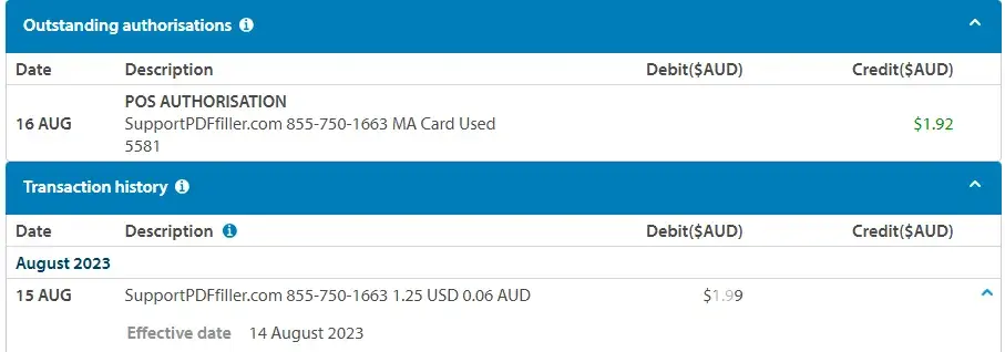 Started a free trial but found PDF Filler to be useless for my need. I cancelled the trial immediately. A month down the line I find ZAR1784.00 (about $96) taken from my account. This was not authorised by me. This is a scam. BEWARE OF THIS COMPANY.