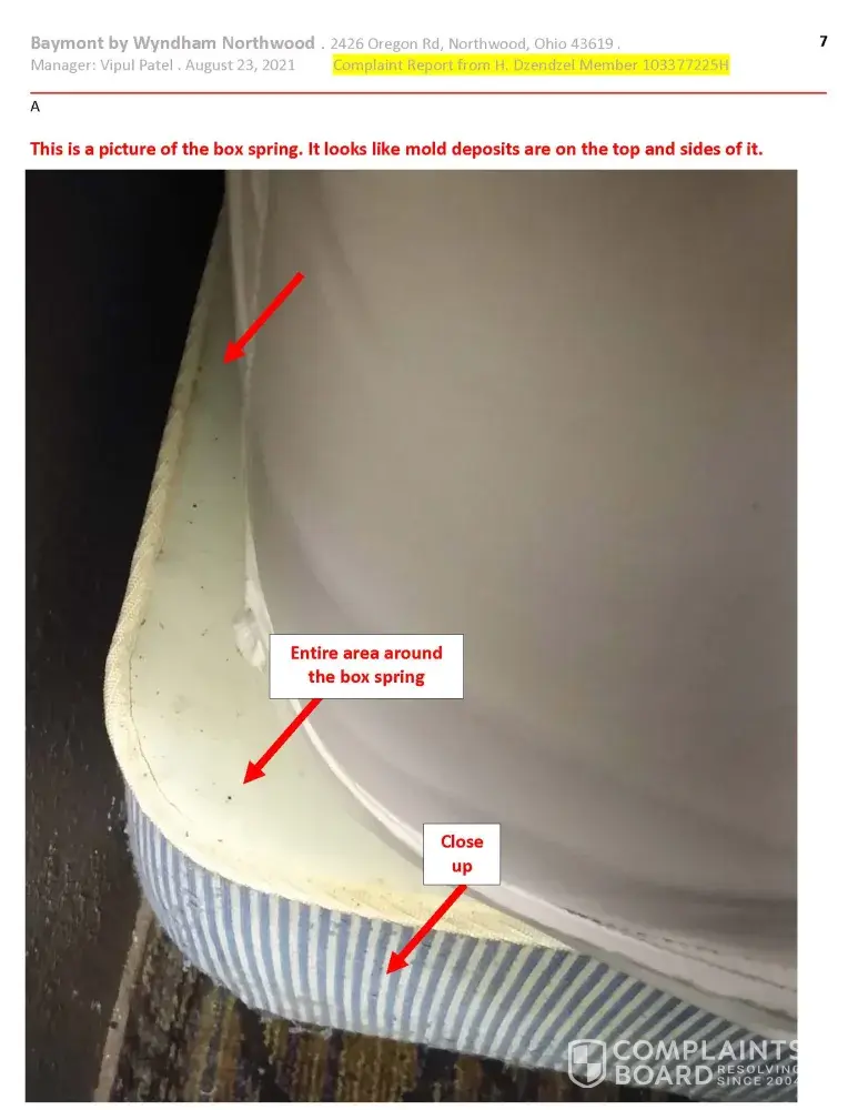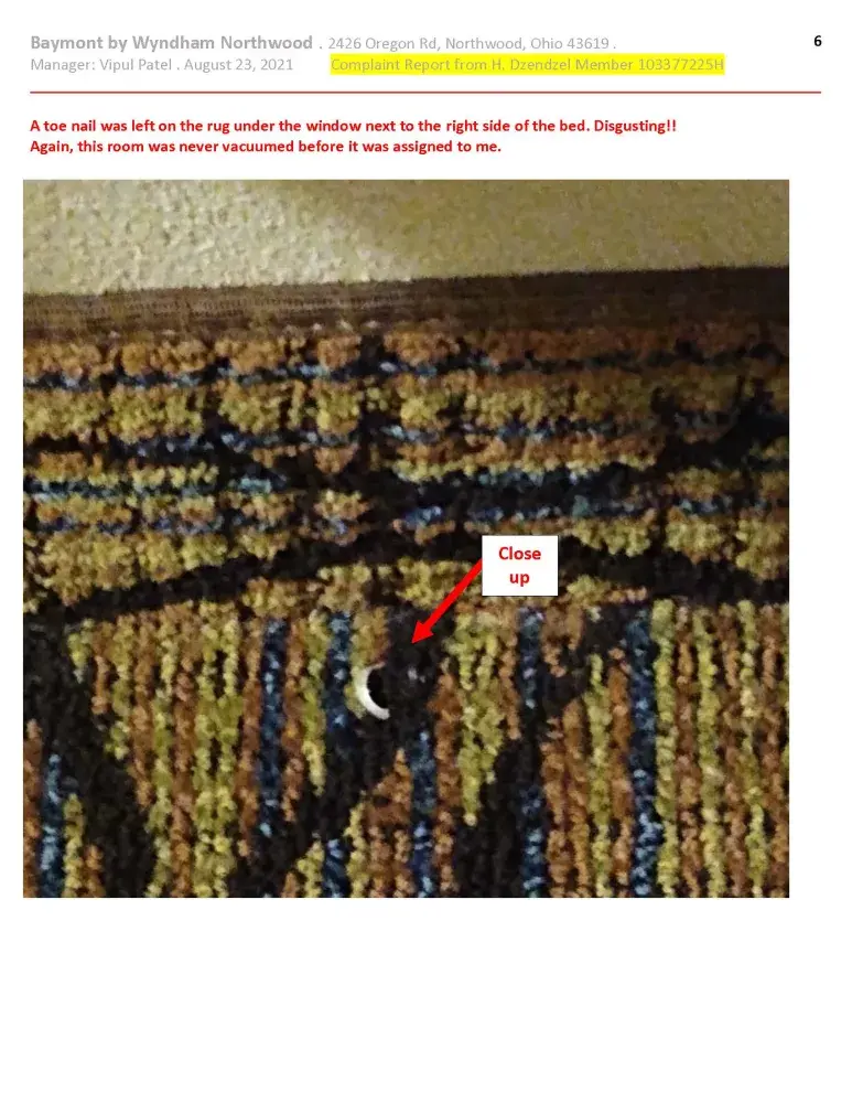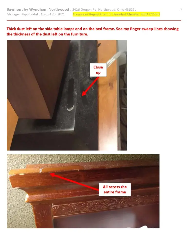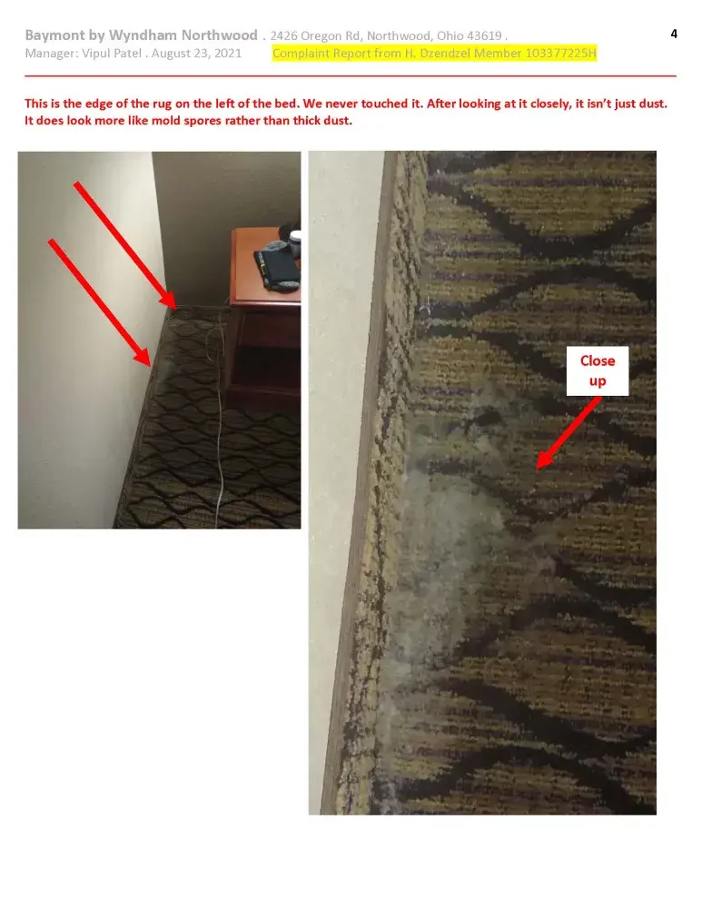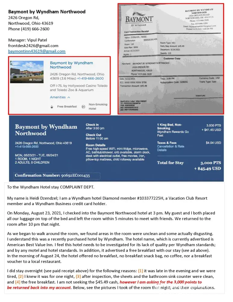 I did stay overnight (see paid receipt attached) for the following reasons: (1) it was late in the evening and we were exhausted, (2) I knew it was for one night, (3) after inspection, the sheets and the bathroom sink counter were clean, and (4) the free breakfast. I am not seeking the $45.49 cash, however I am asking for the 3, 000 points to be returned back into my account. Below, see the pictures I took of the room that night; and their explanations. (If the 15 pictures do not appear, please contact me to resend them to a different address.