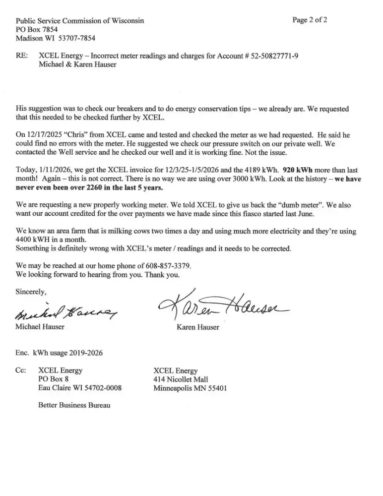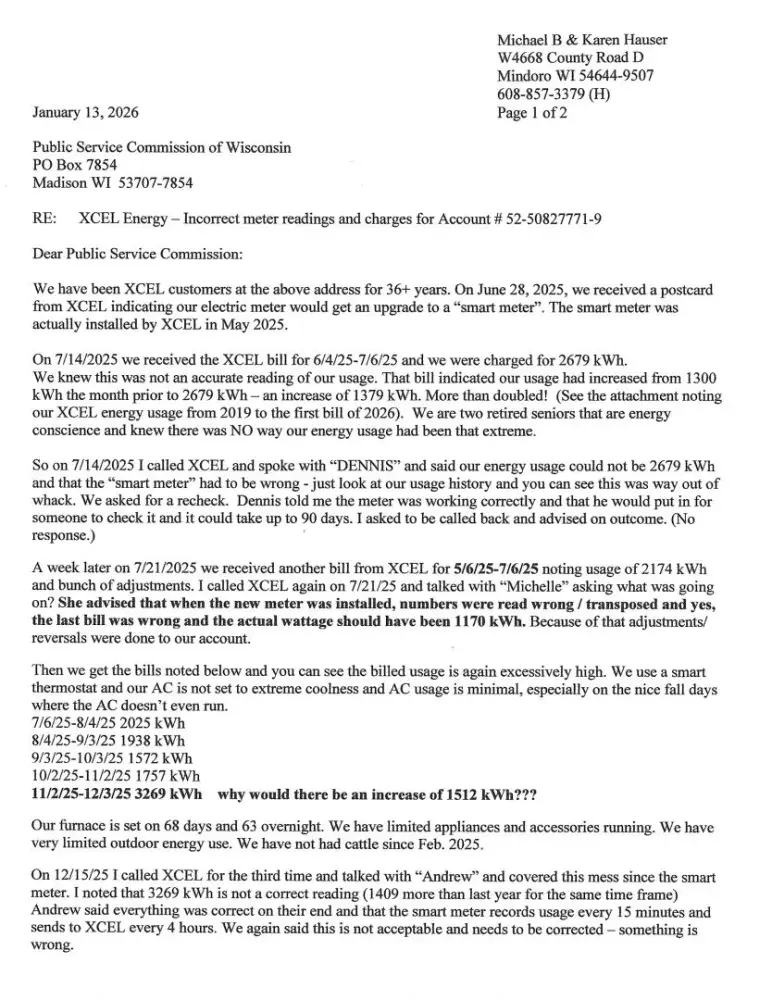 Smart meter installed May 2025. Our kWh usage has been incorrect since installed. After the first bill showed excessive usage, XCEL admitted error in installation. History of usage shows kWH is still excessive and not true to our past actual usage. Smart meter is defective. 1/13/2026 complaint letter sent to WI Public Service Commission