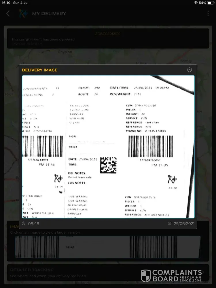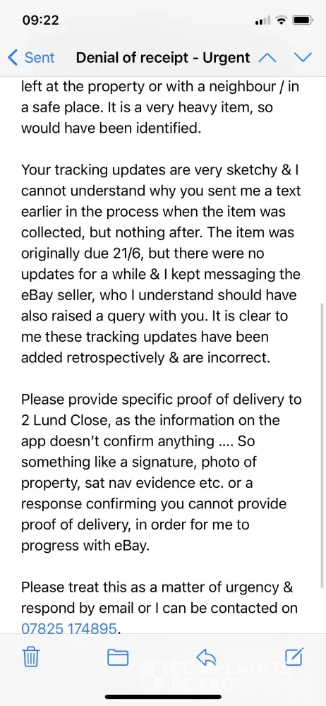 Absolutely shocking! Ordered an expensive wooden garden bench through eBay. Initially stuck at depot for a week, then updated with a delivery estimate of 25/6 2:30-4:30pm. Next update to tracking was 29/6 saying delivered at 08:48 - the delivery image is merely a bad photo of the consignment label. The worst thing is they will only deal with the account holder. The seller was responsive at first, but not getting anywhere so raised a case with eBay .. they advised to raise a "denial of receipt claim by phone or email". Well now sent emails to 3 different addresses & no replies 3 weeks later ... eBay also advised to call on [protected] & guess what they do not answer the phone at 7p per minute ... either cuts off after 10 mins or queues forever. Absolutely appalling. I am that angry that I'm going to make a small claim against them. Tracking information is clearly dodgy & either they have dishonest or just stupid drivers ...