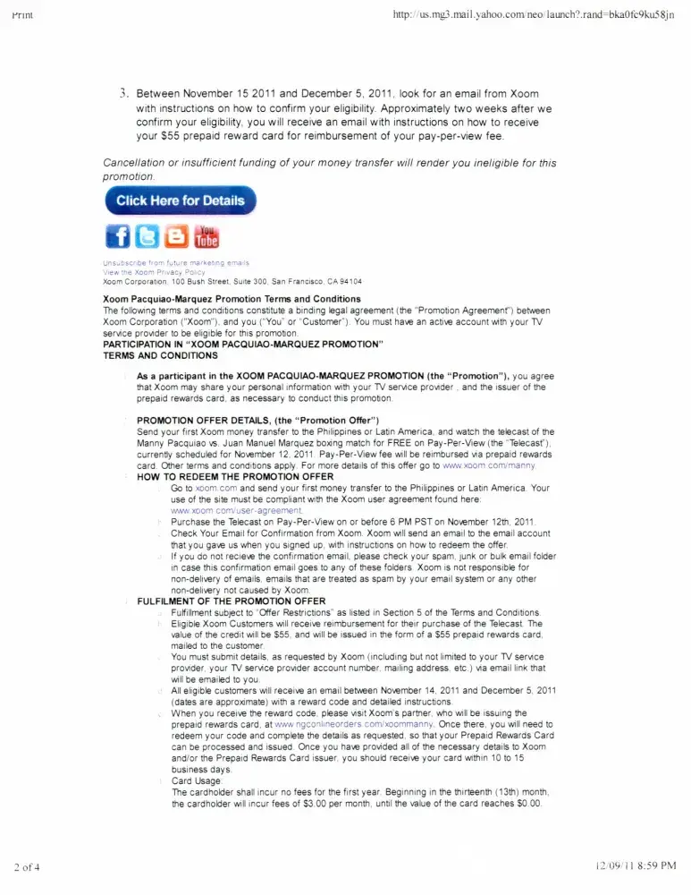 The attached website says that if we send $50 to the philippines by nov. 12, 2011, we will be able to get a $50 debit card in essence, we get the fight for free. Further it said that an email will be sent between nov. 12 thru dec. 5. We talked to two ladies (Sheila is one of them) and the supervisor is carlo and said the website is no longer active and it is unfortunate that we lost the $50. 00. This is bad advertising and should not be tolerated. They claim that the email was sent on nov. 15. We never received this email. It is the principle that counts. $50 is $50. This is very bad business. It appears that xoom is guilty of promoting the pacquiao fight just to get more customers to send money but they never deliver what they promised & misleading the public. I will file a complaint with the federal trade commission and better business bureau.