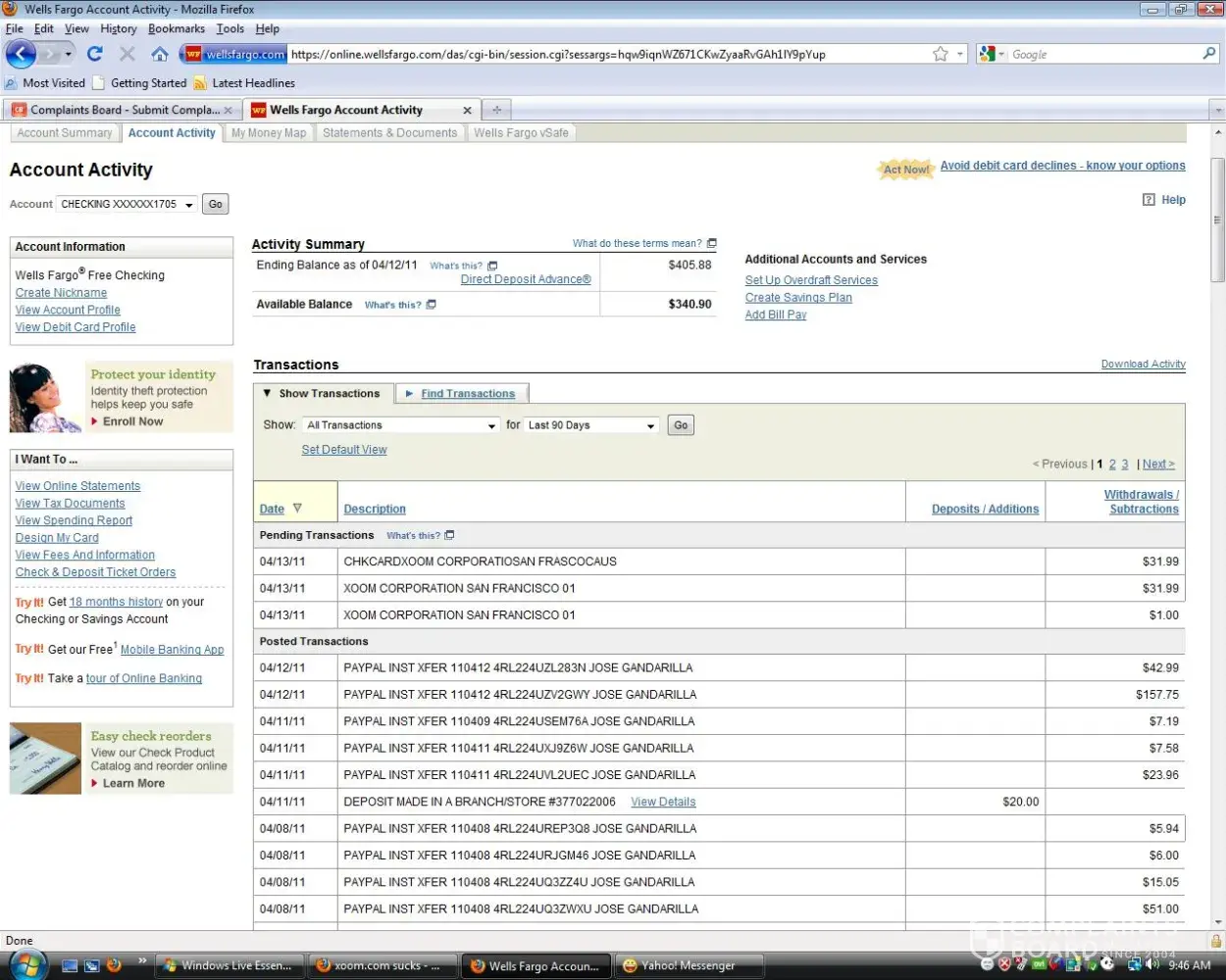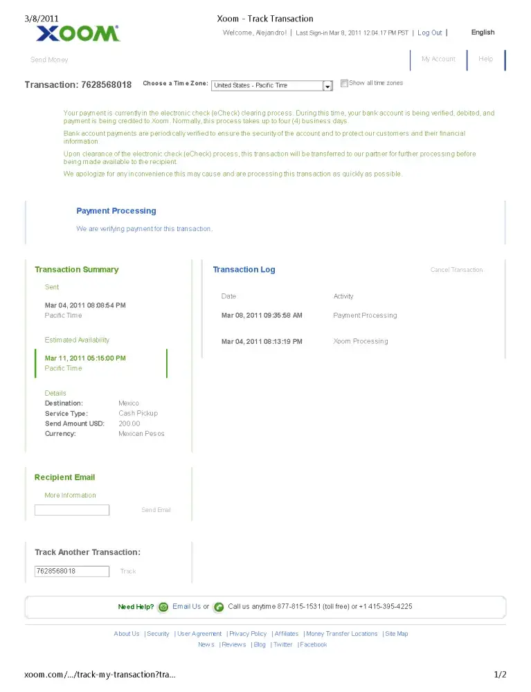 March 7th, 2011.- I checked up in xoom.com under my account and they just live a message saying that it will take 5 to 7 business days to clear the money from my bank