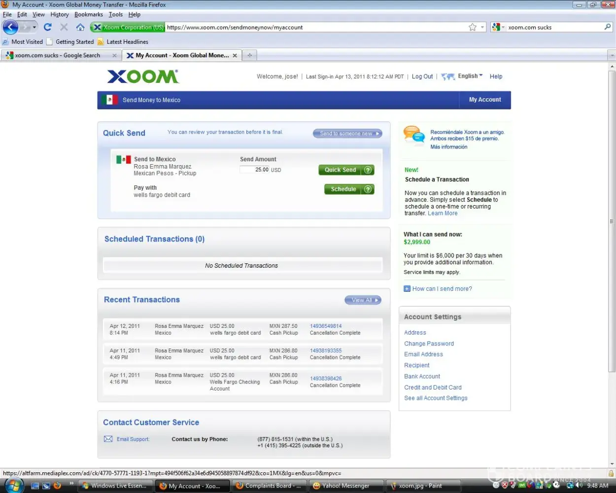 March 8th, 2011.- I called xoom customer care, they just apologize for the inconvenience and claim it will take 3 to 5 business days to clear the transaction on my bank (it seems to be this the number of days they say to all their customers). I tried to cancel the transaction but they said it will take 30 to 60 days to get the refund of my money!