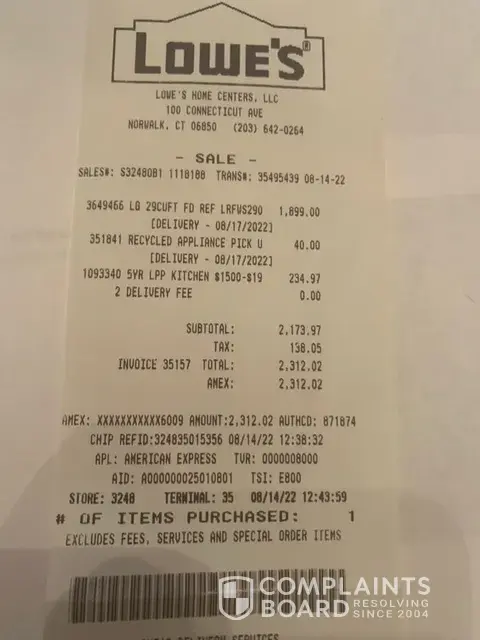 We ordered a new refrigerator from Lowes in Norwalk, Ct. on Aug. 14, 2022. We had it delivered on Aug. 17, 2022. Upon delivery the 2 delivery men dented the refrigerator in several places trying to force it in between the wall and bannister. There is also damage to our wall. All the time they were yelling. I tried to say take it easy you're damaging the wall and refrigerator. When they got the refrigerator in the kitchen I pointed out all the damage. They said are you refusing the refrigerator. I wanted to say yes but was afraid of further damage to my home.