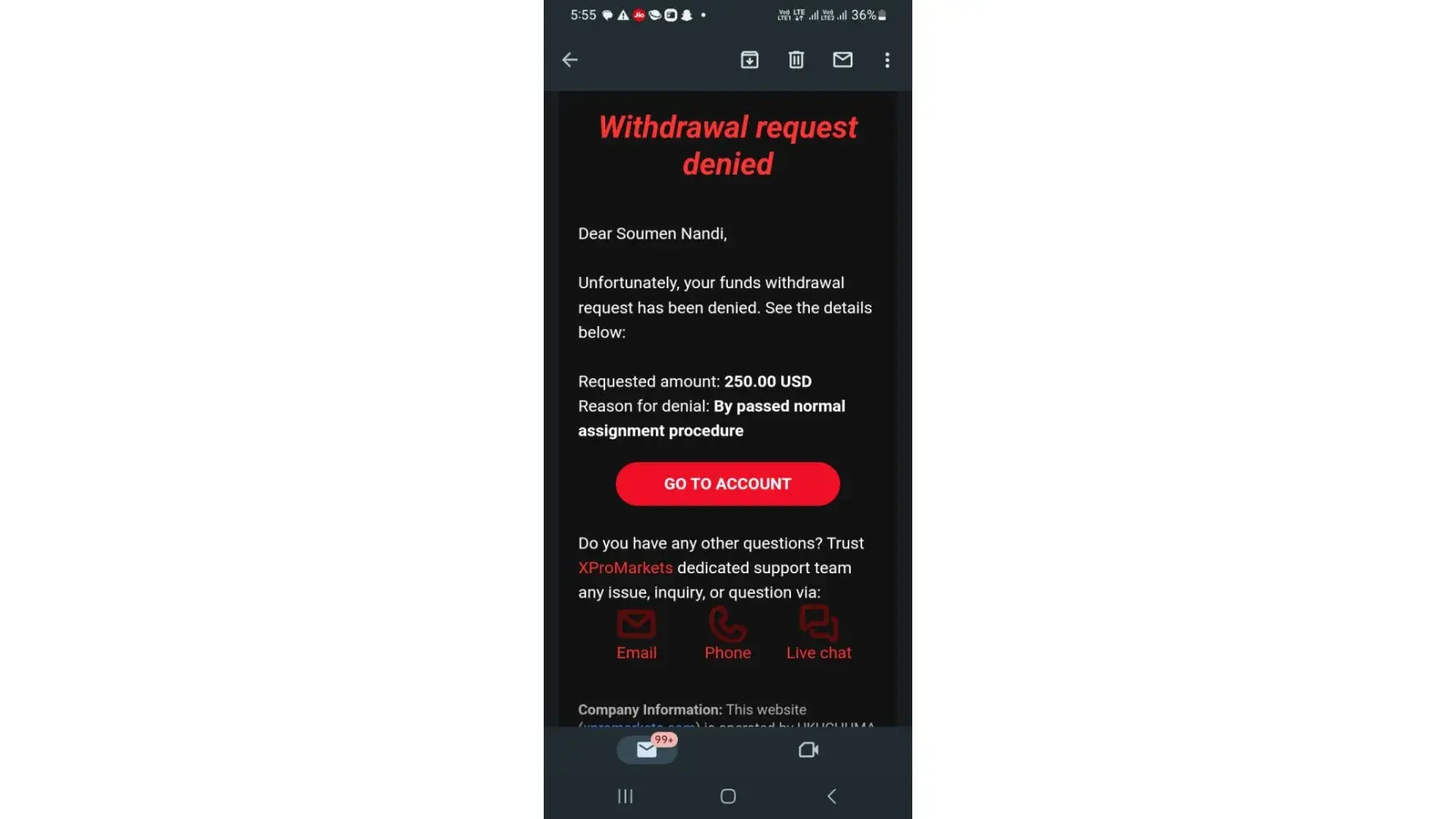 Xpromarkets mailed me about denial of withdrawal. But the amount doesn't not shown in my trading account balance.