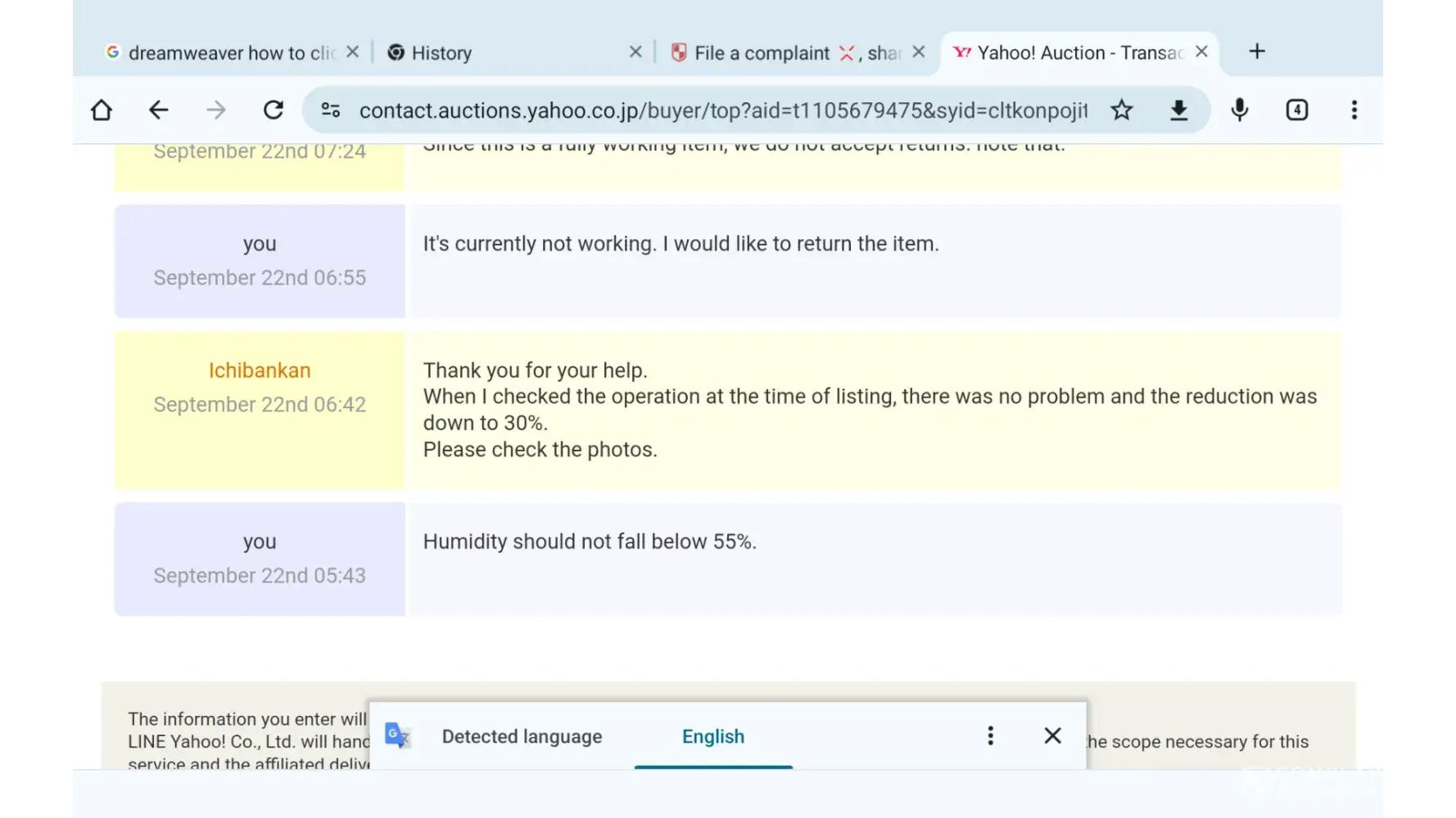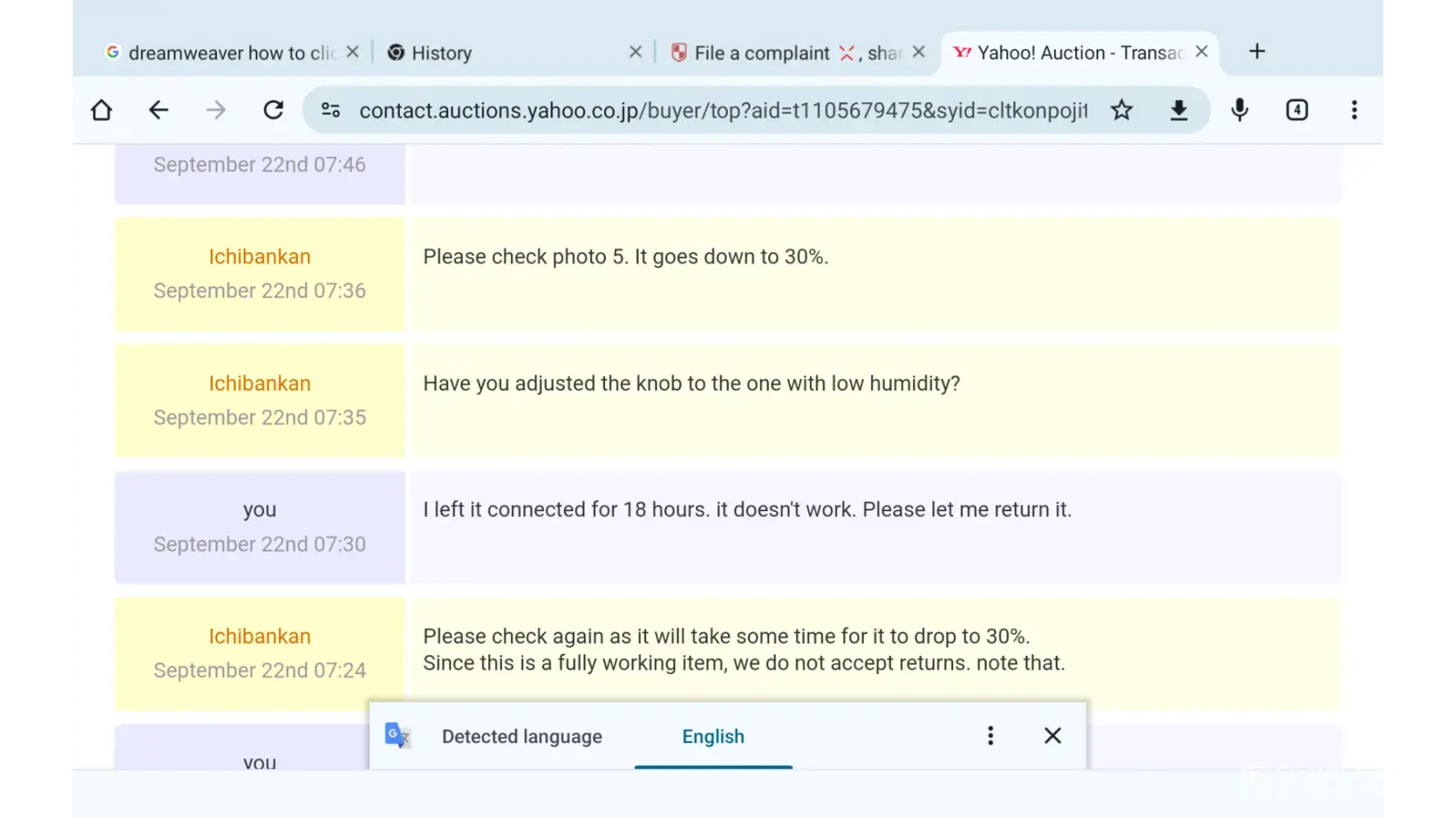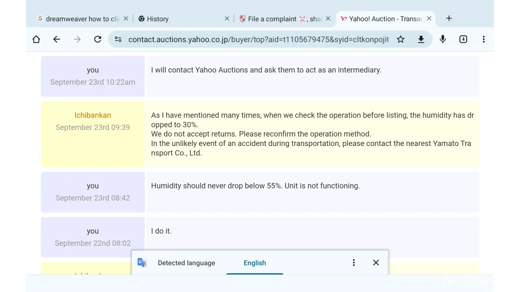 I bid on a camera dry cabinet. It was a used item, but the seller said that it was fully functional. I won the bid but the item I received did not work. It failed to lower the humidity. I wrote to the seller but they insisted it was functional. Finally I wrote to Yahoo, but they did not respond to my complaint. The auction took place August 16th. Number t1105679475.