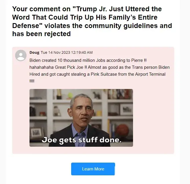 Yahoo Moderators Say I am Violating their Community standards every other day. I don't Use Profanity or anything I see that would Violate them. Here is an example last ( 11/13/23 ) night rejected. Everything I said in that comment WAS TRUE, just not going along with their Agenda. They let comments by the left slide through by the hundreds EVERY DAY without deleting comments.
