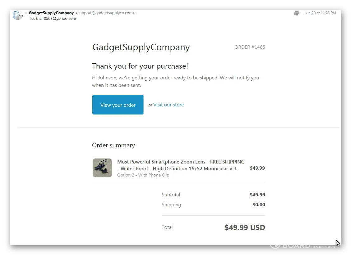 Hi, I saw this ad in Yahoo webpage selling this Zoom lens for smartphones. I made the purchase on 6/20 and got the confirmation letter with the order number. After almost a month did not receive anything so I sent email to [protected]@gadgetsupplyco.com with no response. Sent 3 follow-up letters still no reply. Tried to call them but the phone number doesn't exist. Suspect this is a false merchant. Can you help me to get my money back? Thanks