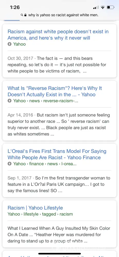 I typed in a search and their top searches was the most racist thing I have ever seen. Yahoo is well known to be a liberal biased company, but this is unacceptable. I want this to be handled like other stories. I want the leaders of Yahoo to acknowledge they push this narrative for their agenda. They should post a warning that they support biased liberal agendas and hide conservatives point of views.