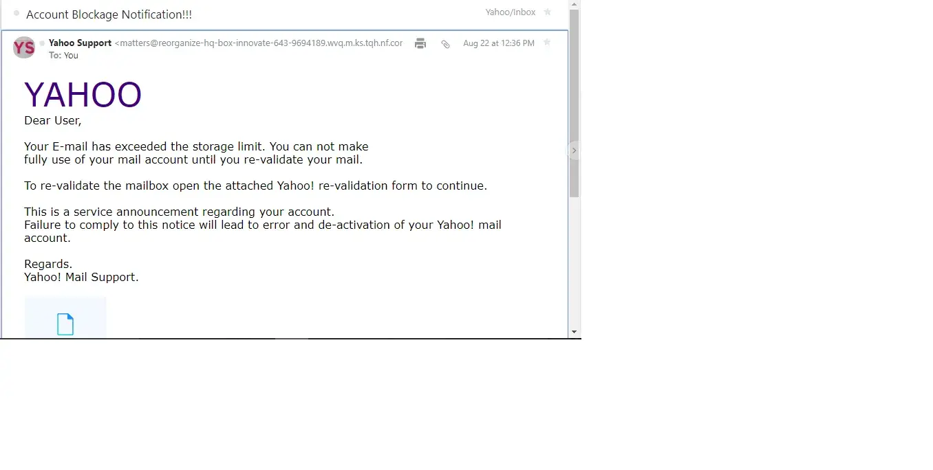 Apparently, said email cautioned me that email storage has already been exceeded and further states that I need to re-validate my email otherwise failure to comply to said notice will lead to error and de-activation of my Yahoo.
