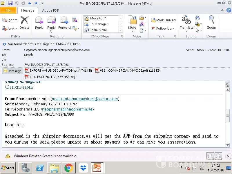 . Our company deals in Manufacturing of spares. Our customer have received a fake email from yahoo email address id pi.[protected]@yahoo.com .